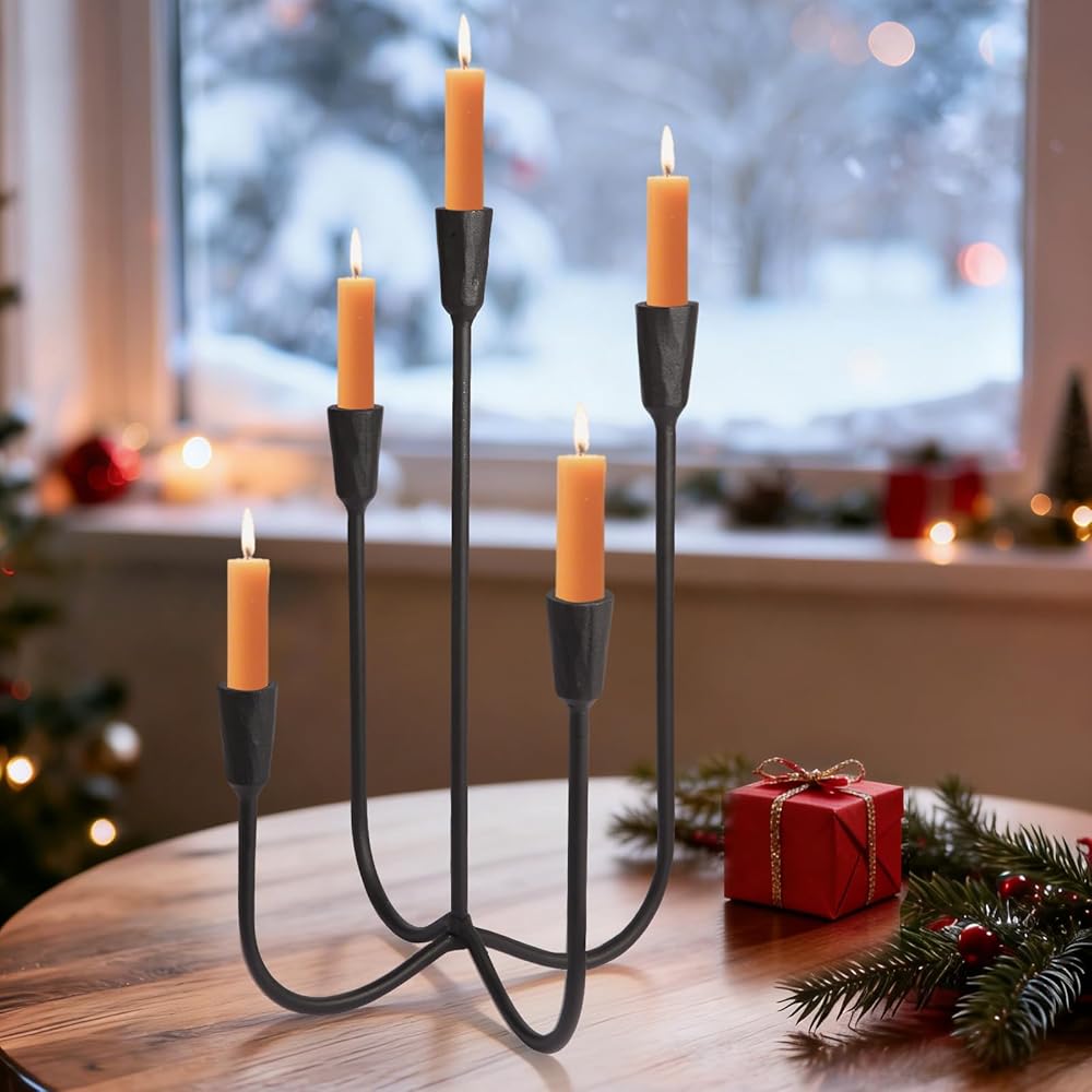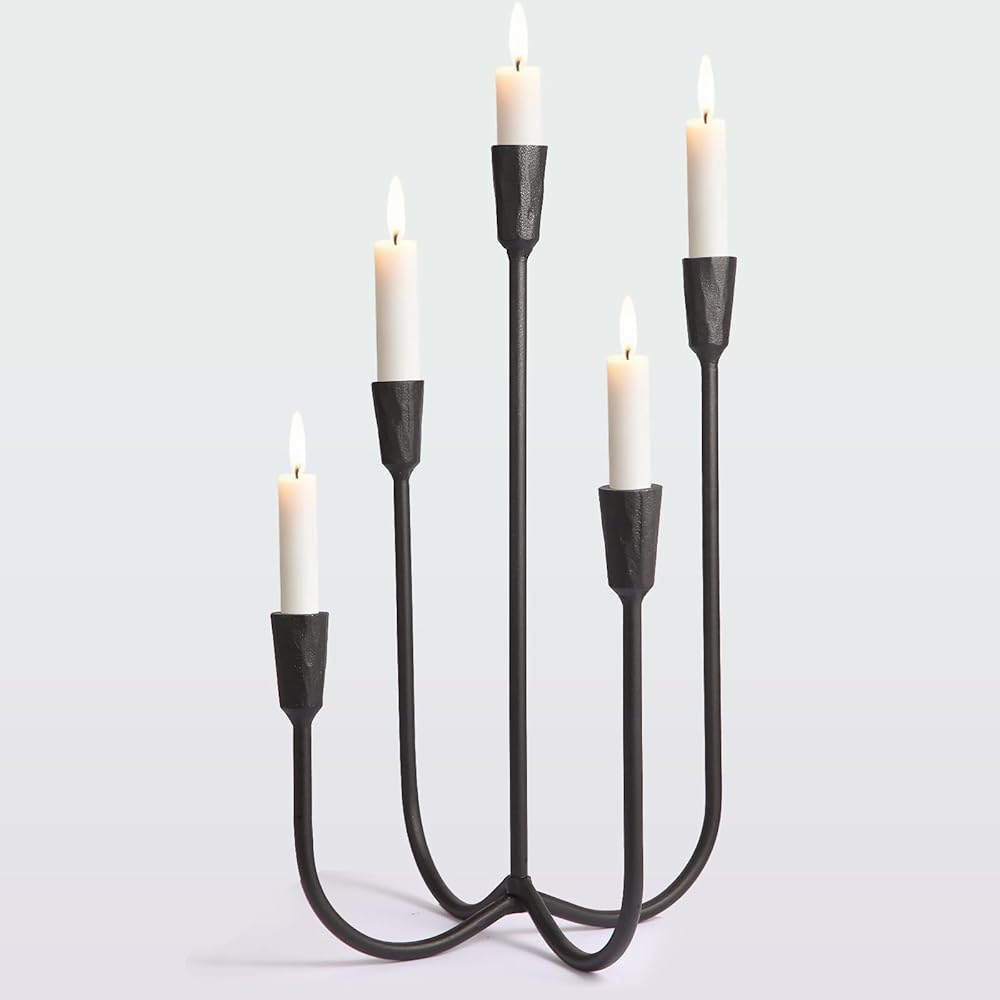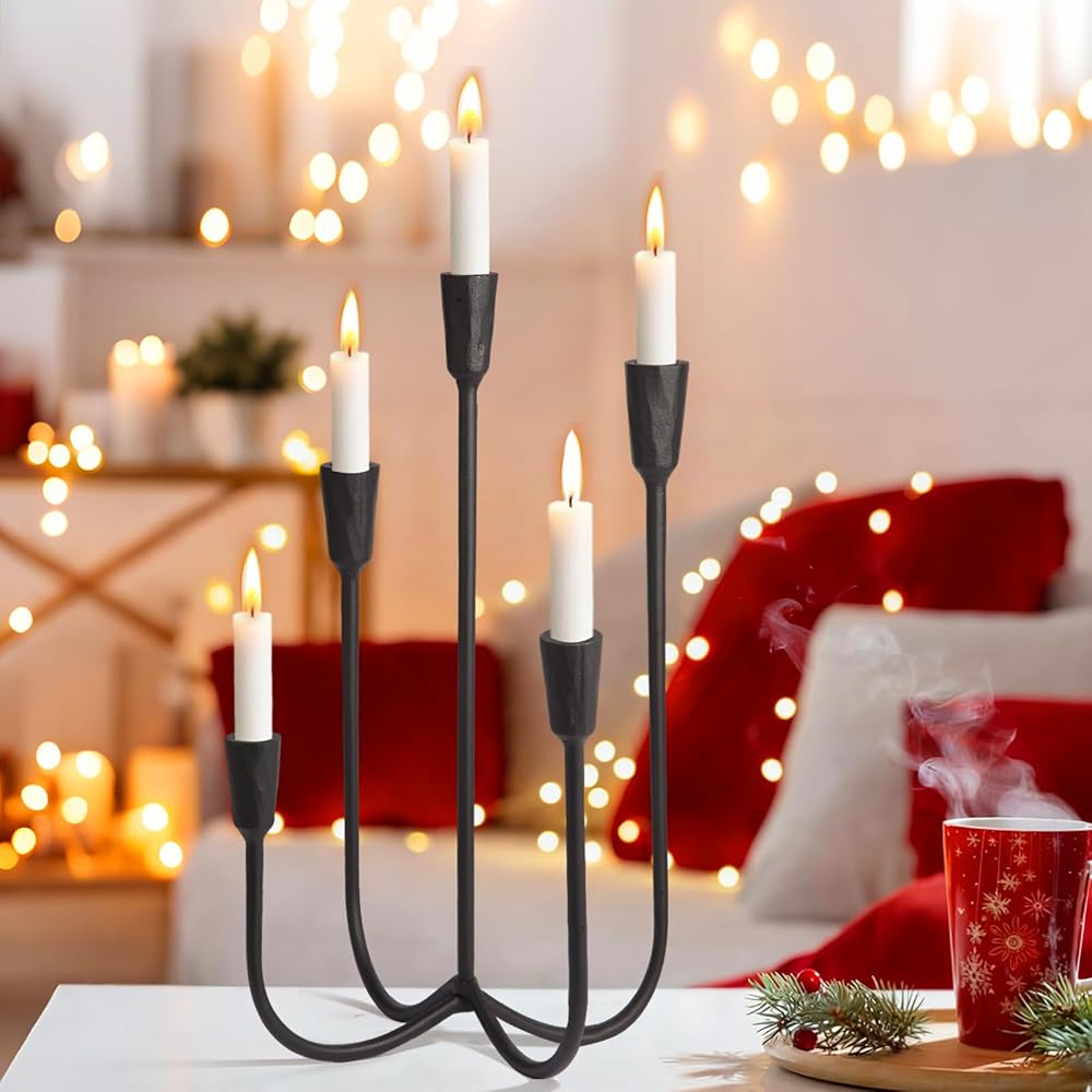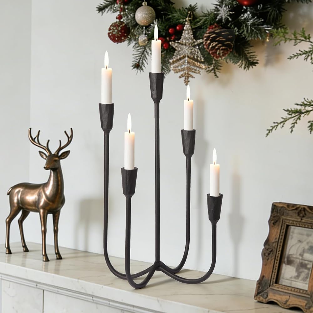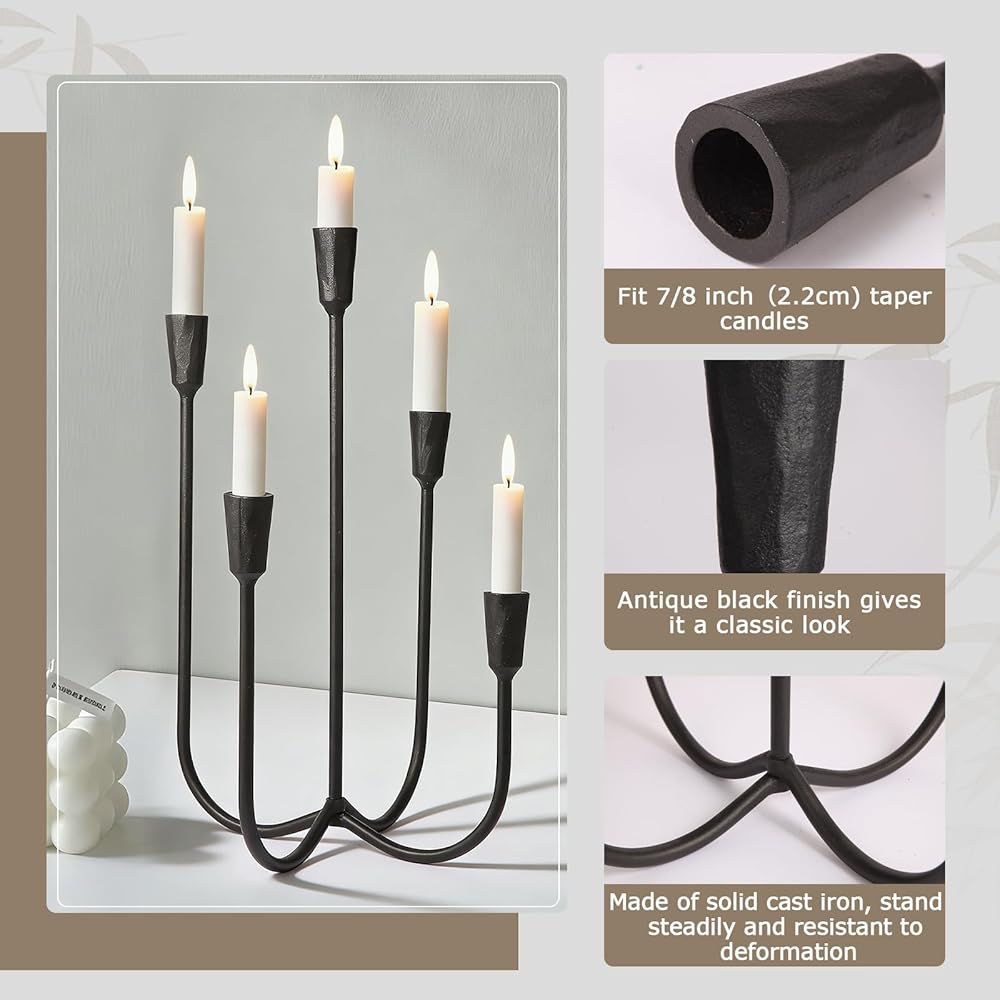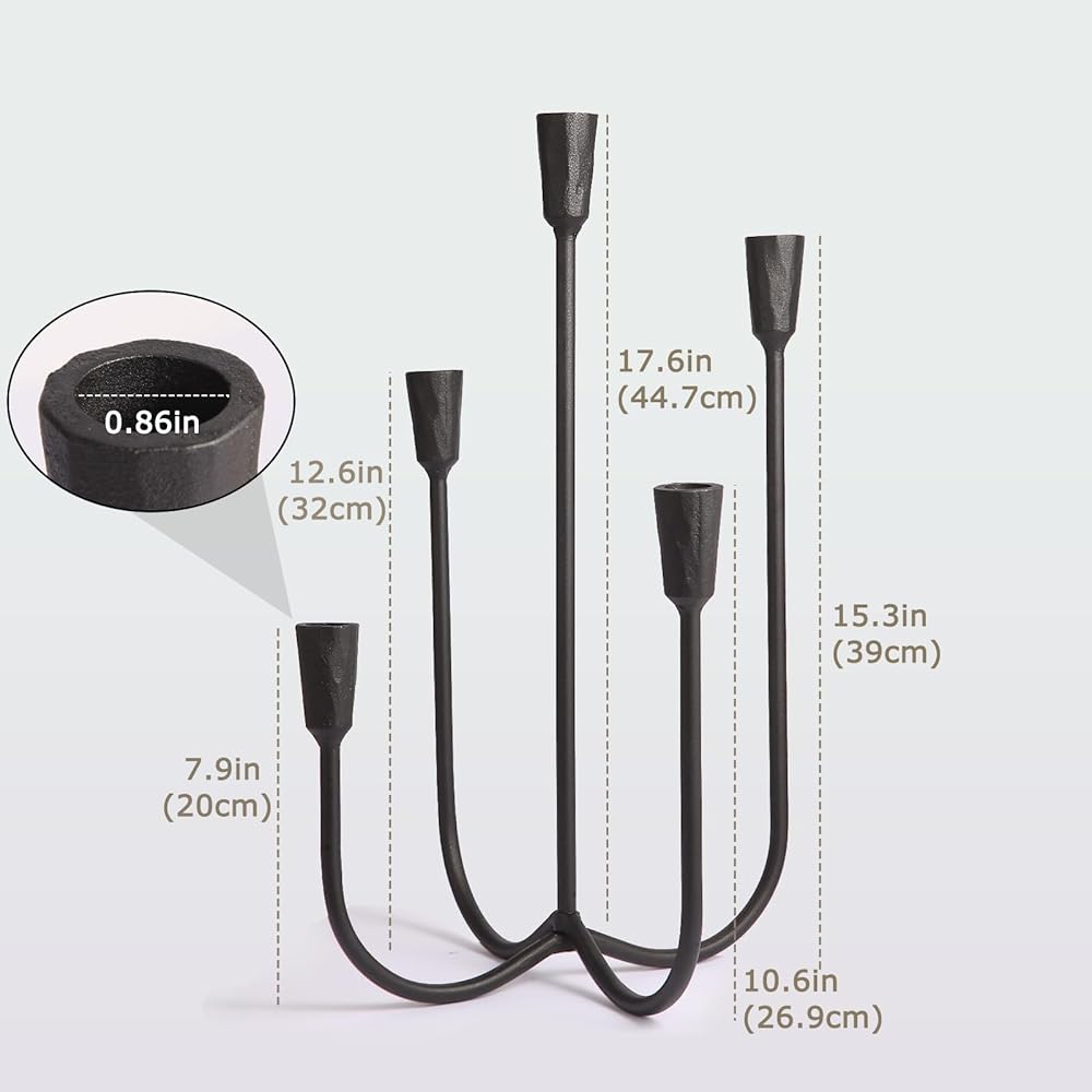 • Heavy-Duty Cast Iron Construction: Built from solid cast iron, this 5-arm candelabra is designed to last. Its robust structure ensures unwavering stability, securely holding standard taper candles for worry-free use during extended gatherings or everyday ambiance.