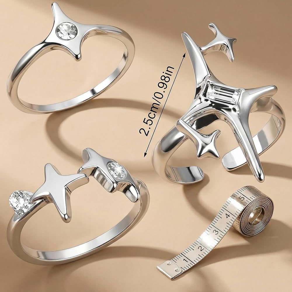 مجموعة 3 قطع من خواتم المفصل ذات اللون الفضي العتيق، حلقات مفتوحة على شكل نجمة مجوفة قابلة للتعديل للتكديس والطبقات، مجوهرات مكتنزة للرجال والنساء، إكسسوار الجرونج القوطي الجمالي