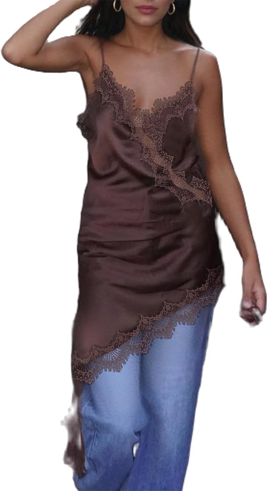 Feature: Silk tank tops for women, satin camisole, spaghetti strap satin cami, high low cami tops for women, sleeveless, solid color, lace slip silk dress, irregular hem sleeveless long tops, flowy high low tank shirt, v neck sheer lace dressy casual tops