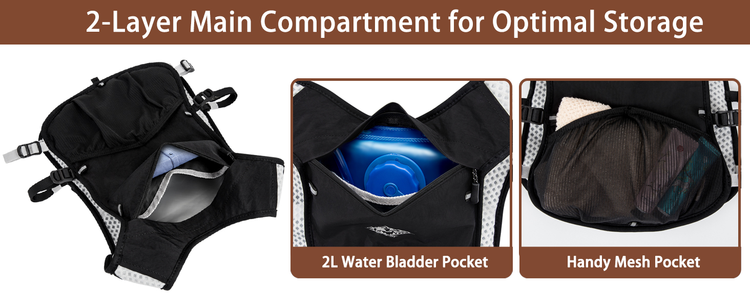 2 Pcs waterproof running vest: Includes a 5.5L running vest for men and a 2L EVA water bladder. The mens running vest features a dedicated waterproof hydration pocket with 2 fixing buckles to securely hold the included water bladder, separated from other things in the main compartment to prevent leakage. Designed with a leakproof bite valve and wide opening for fast refill, the hydration bladder is ideal for 2-4 hour journey. Stay hydrated on the run with our running vest with water bladder