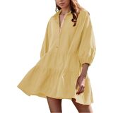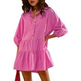 فستان بيبي دول صغير فضفاض صيفي كبير الحجم، يتميز بياقة مطوية لأسفل، وزر أمامي، وأكتاف منسدلة، وأكمام منتفخة 3/4 مع أطراف أكمام مرنة، وتفاصيل مطوية فريدة من نوعها، وطول فوق الركبة، وجيوب قطنية مناسبة