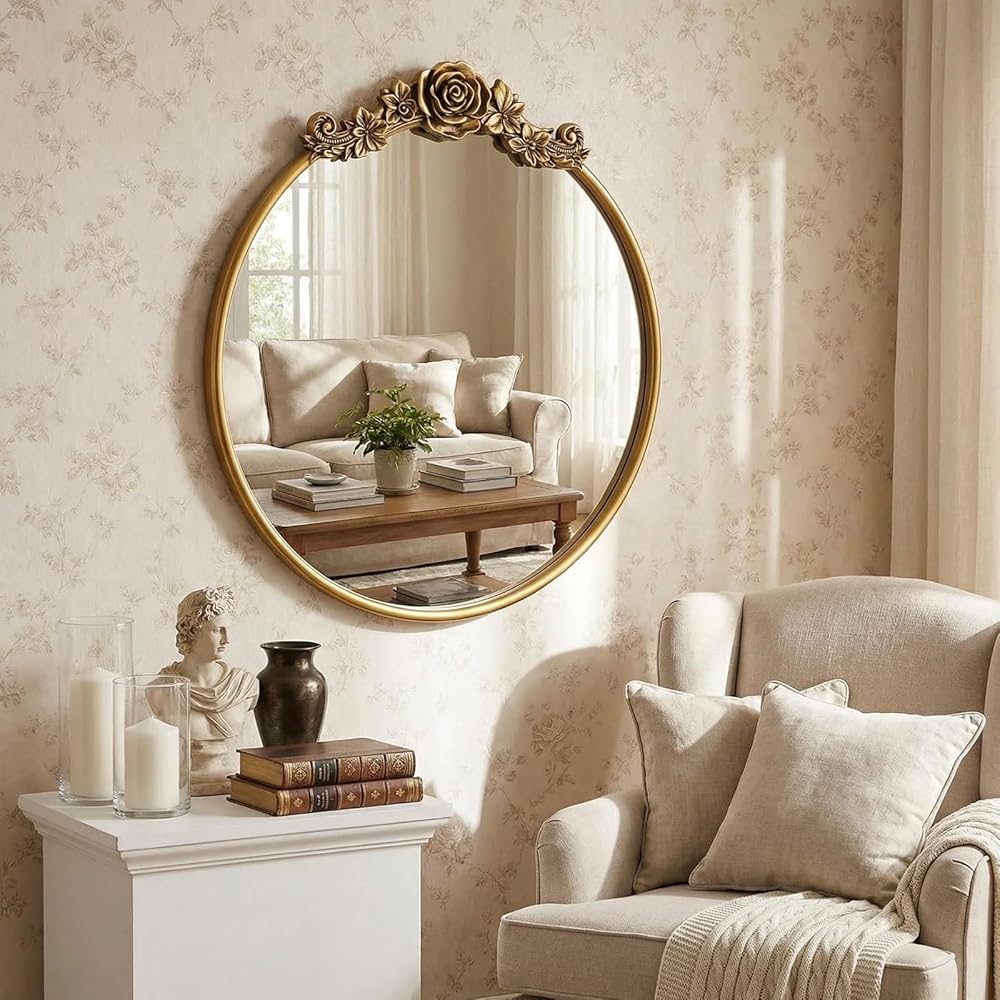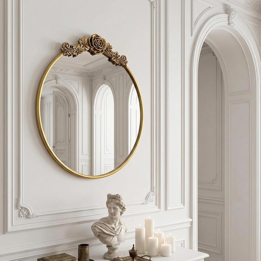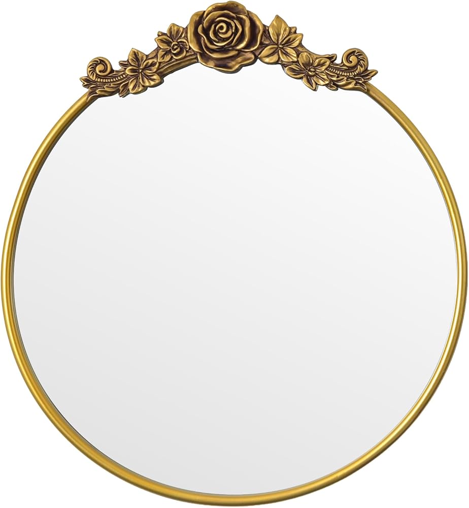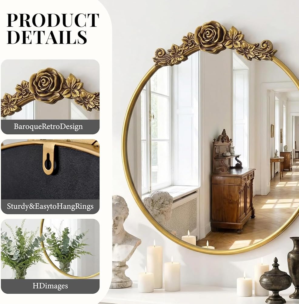 Baroque Aesthetic Mirror: Exquisite flower patterns adorn the round frame, paired with a vintage gold finish that embodies the grandeur of vintage Baroque style. The soft curves of the round shape blend with ornate details, adding a touch of royal elegance to any home space.
