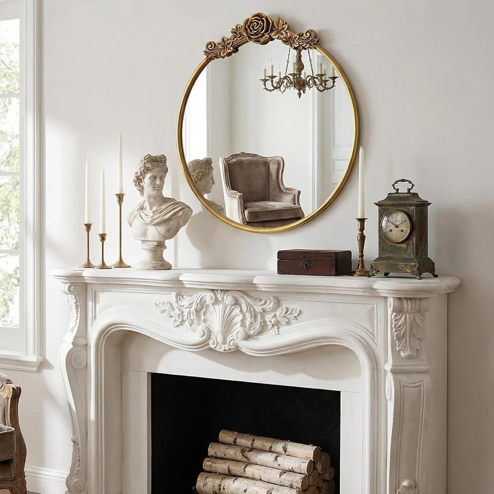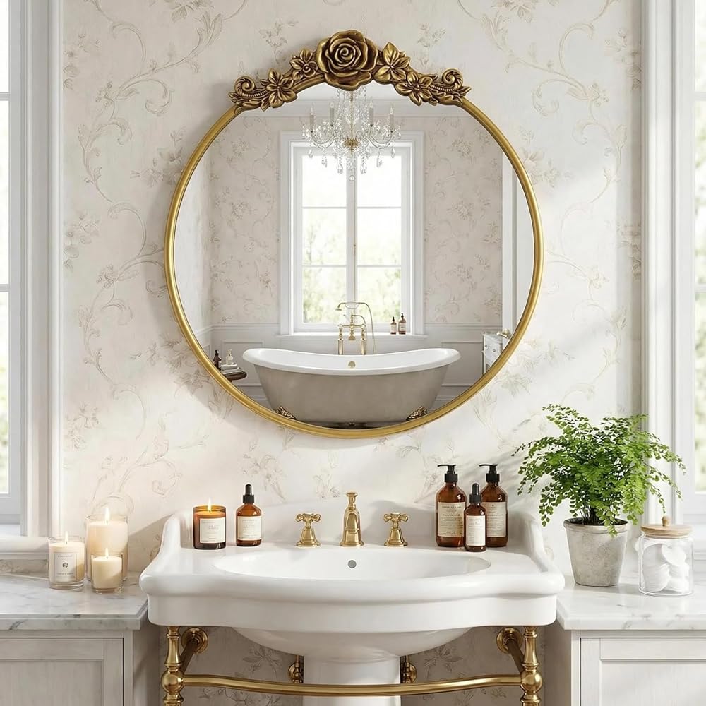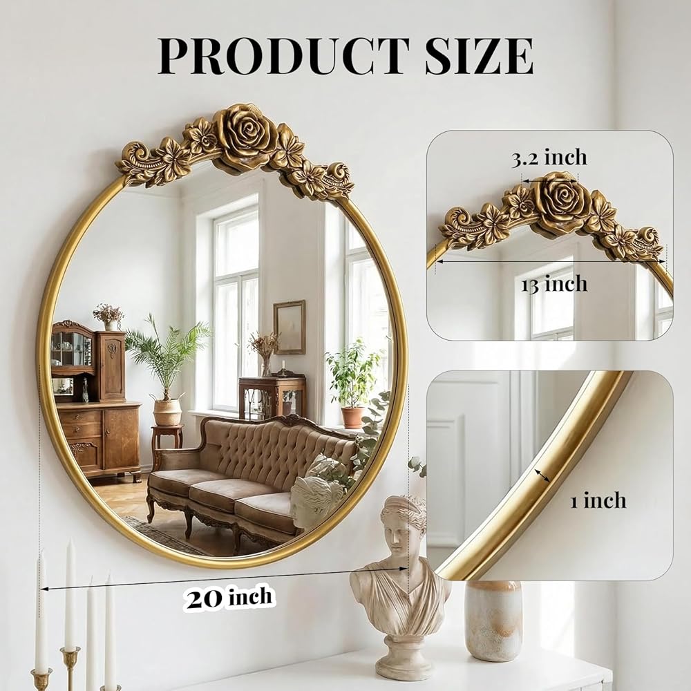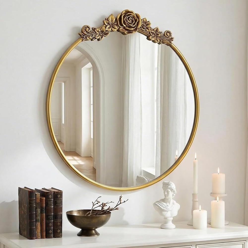 Baroque Aesthetic Mirror: Exquisite flower patterns adorn the round frame, paired with a vintage gold finish that embodies the grandeur of vintage Baroque style. The soft curves of the round shape blend with ornate details, adding a touch of royal elegance to any home space.