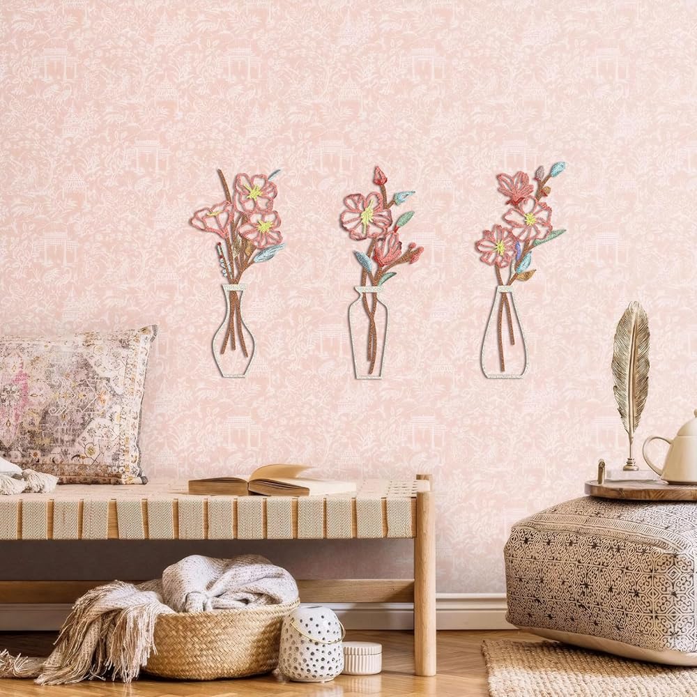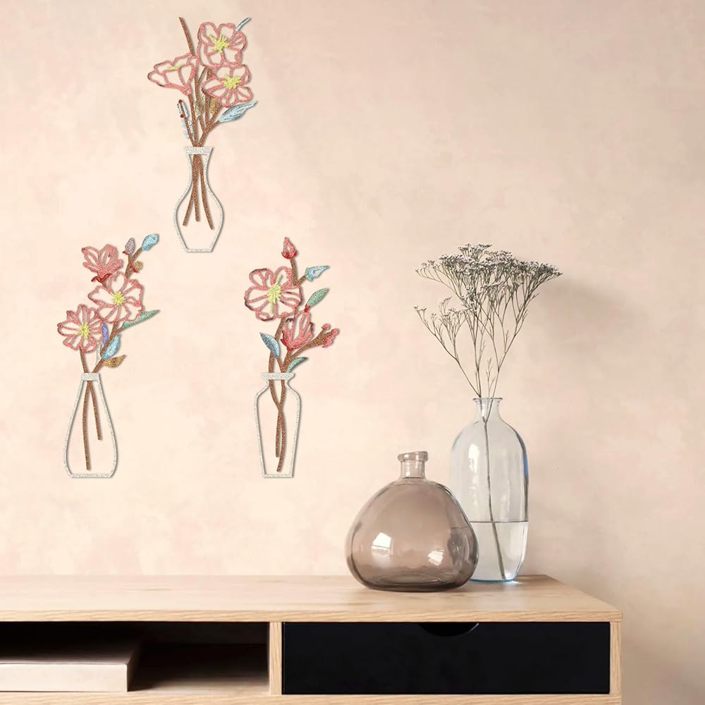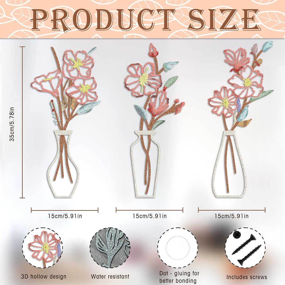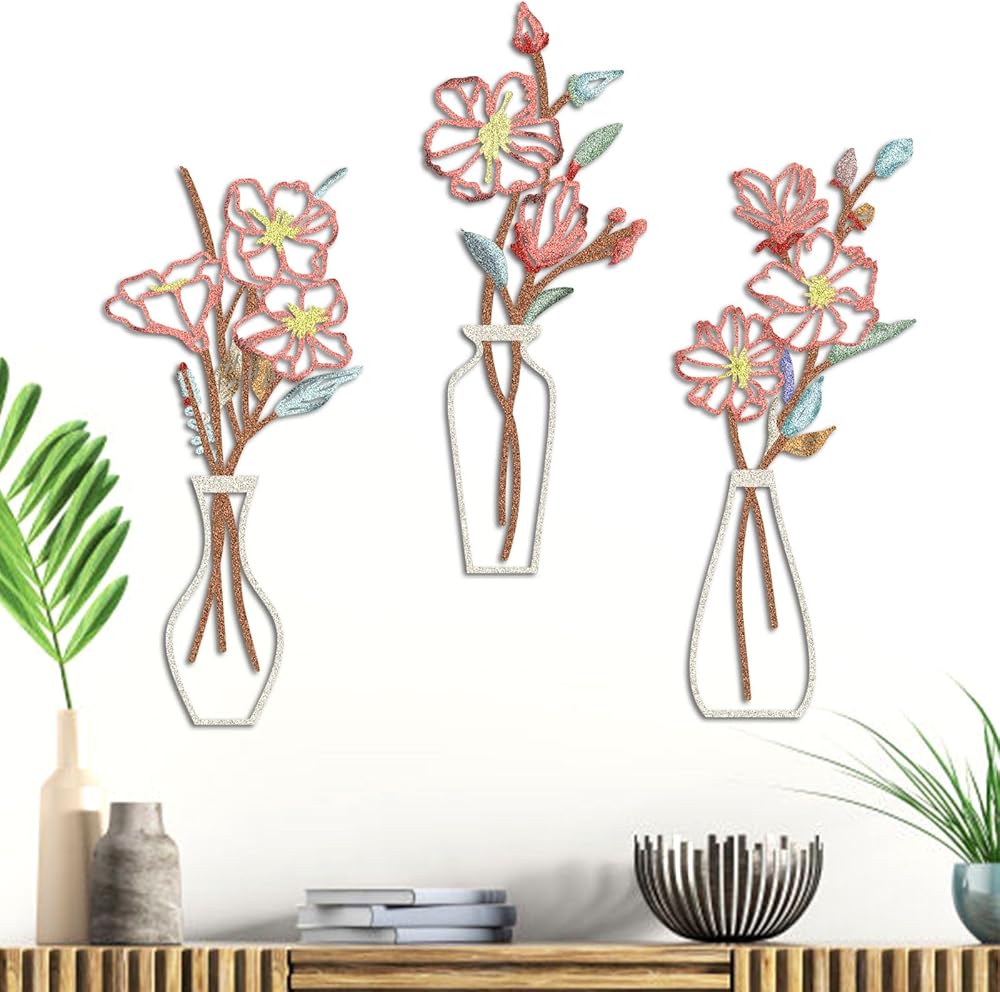 فن حائط الأزهار: يتميز تصميمنا الفني الجداري الزهري المكون من 3 قطع بأزهار وأوراق شجر مخرمة للحصول على تأثير ثلاثي الأبعاد. يُظهر التصميم الكلاسيكي للمزهرية والزهور أناقة خالدة من شأنها تنشيط أي غرفة وإضفاء طابع طبيعي عليها.