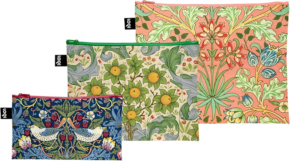 Show off your personality and keep your essentials secure with Loqi Zip Pocket Sets. Each set includes three zippered pouches in coordinating designs and varying sizes—Mini (5" x 9"), Midi (8" x 11"), and Maxi (10" x 13"). Great for organizing everything from art supplies and tech accessories, each pouch is made of 100% recycled polyester and are water-resistant. They are incredibly lightweight and designed for durability without sacrificing style. - Loqi Zip Pocket Set - William Morris, Set of 3Sarut Zip Pockets, WILLIAM MORRIS - This set features three pockets with selections of William Morris's elegant floral artwork.