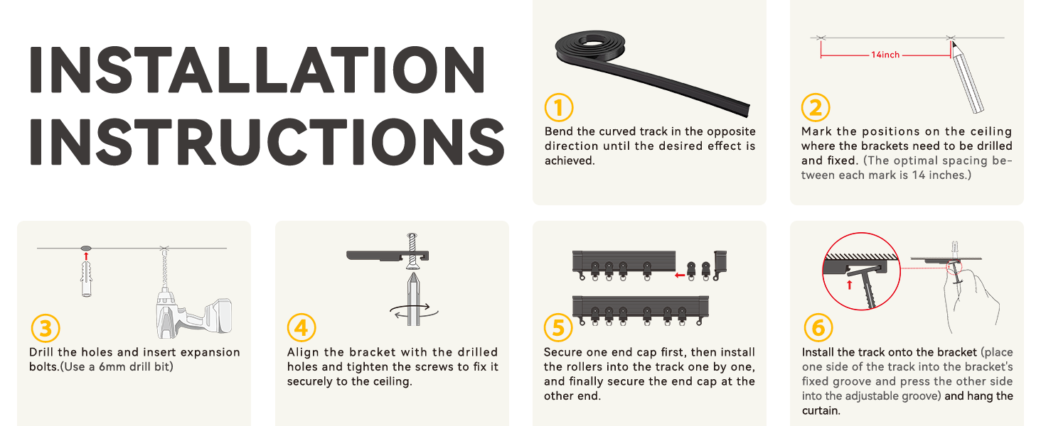 تركيب سهل: لفرد المسار قبل التركيب، ما عليك سوى استخدام المجفف أو نقعه في ماء دافئ لبضع دقائق. يمكن تركيب مسارات الستائر المرنة لدينا بسهولة باستخدام أقواس ملائمة ومسامير تثبيت الحوائط الجافة ذاتية الثقب وبكرات منزلقة - لا توجد حاجة لأي أدوات خاصة. قم بثنيها بالشكل المناسب للزوايا أو المنحنيات أو النوافذ الكبيرة، ثم قم بقصها إلى الحجم المناسب باستخدام منشار ذو أسنان دقيقة.