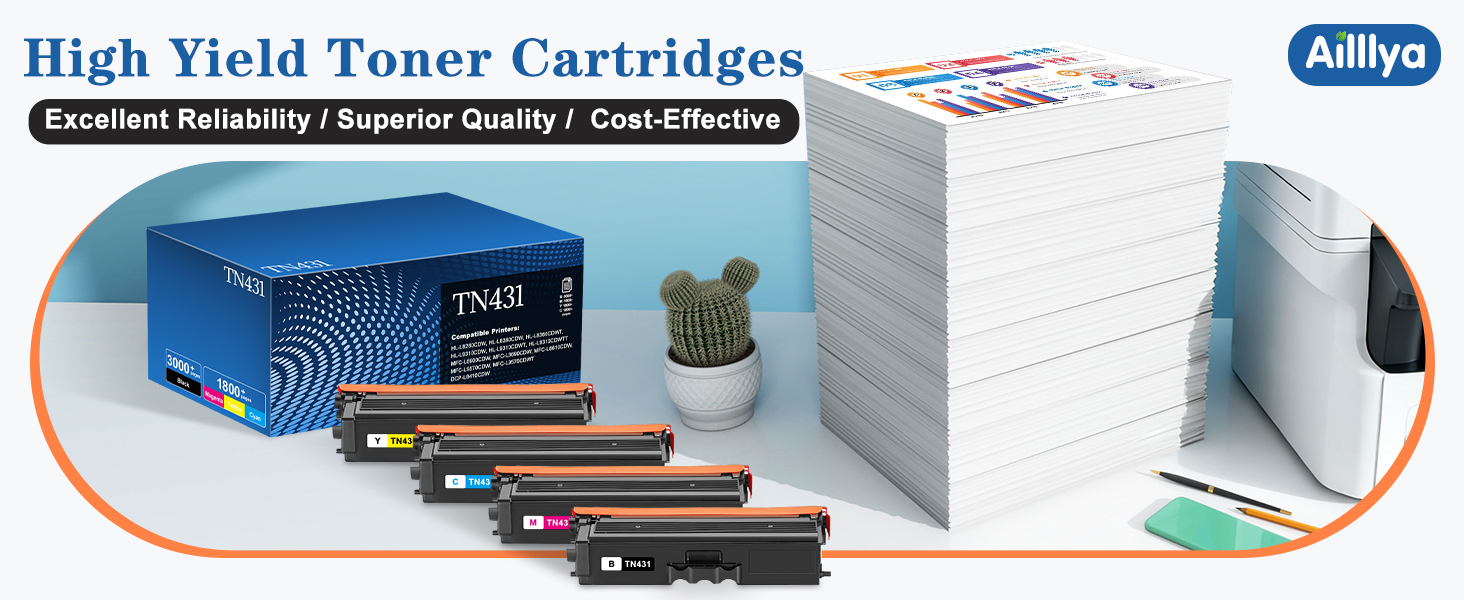 إنتاجية عالية للصفحة: ما يصل إلى 3000+ صفحة لكل خرطوشة حبر سوداء TN431 TN-431 و1800+ صفحة لكل خرطوشة حبر TN-431 TN431 ملونة (TN431C TN431M TN431Y) بتغطية 5% (Letter/A4)