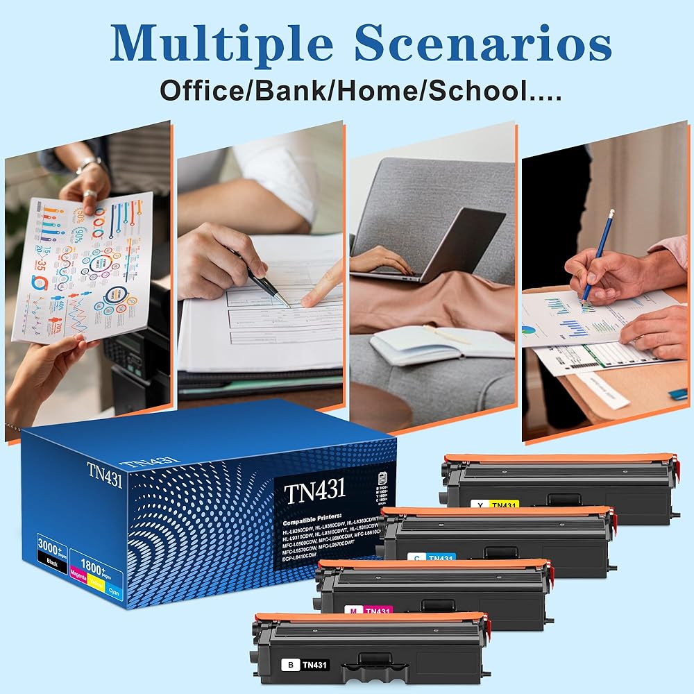 محتوى العبوة: خراطيش حبر TN431 4 عبوات مع رقائق، بما في ذلك 1 خرطوشة حبر أسود TN431، 1 خرطوشة حبر سماوي TN431، 1 خرطوشة حبر أصفر TN431، 1 خرطوشة حبر أرجواني TN431
