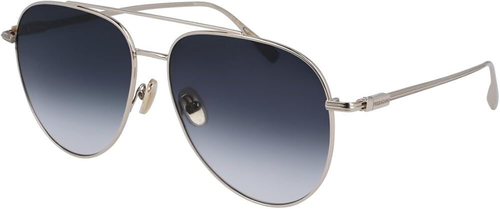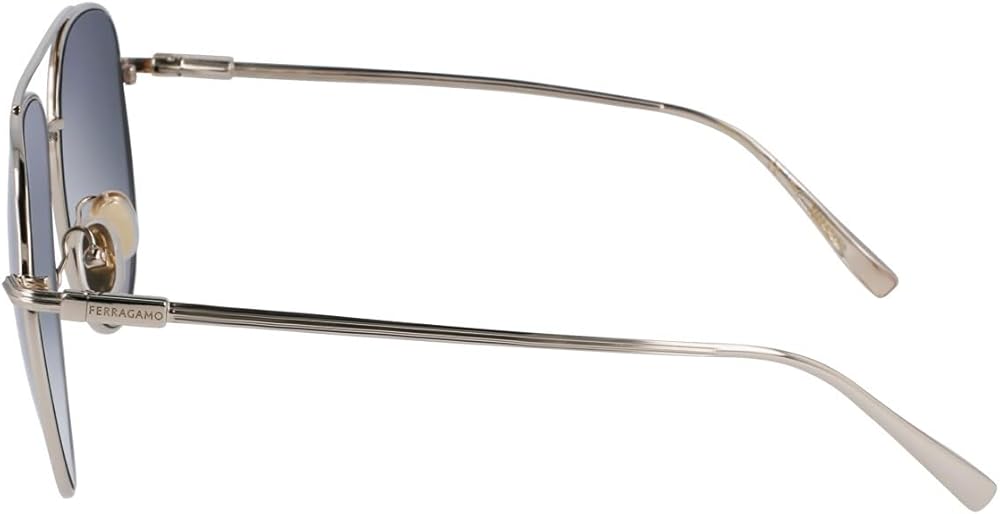 Ferragamo Sunglasses. Series number: SF308S. Color code: 715. Color: Light Gold. Shape: Pilot. Lens Width: 61 mm. Lens Bridge: 15 mm. Arm Length: 145 mm. 100% UV protection. Non-Polarized. Frame Material: Metal. Frame Color: Light Gold. Lenses Type: Blue Gradient. Rim Style: Full-Rim. UPC/EAN code: 886895610179. Ferragamo Blue Gradient Pilot Men's Sunglasses SF308S 715 61.