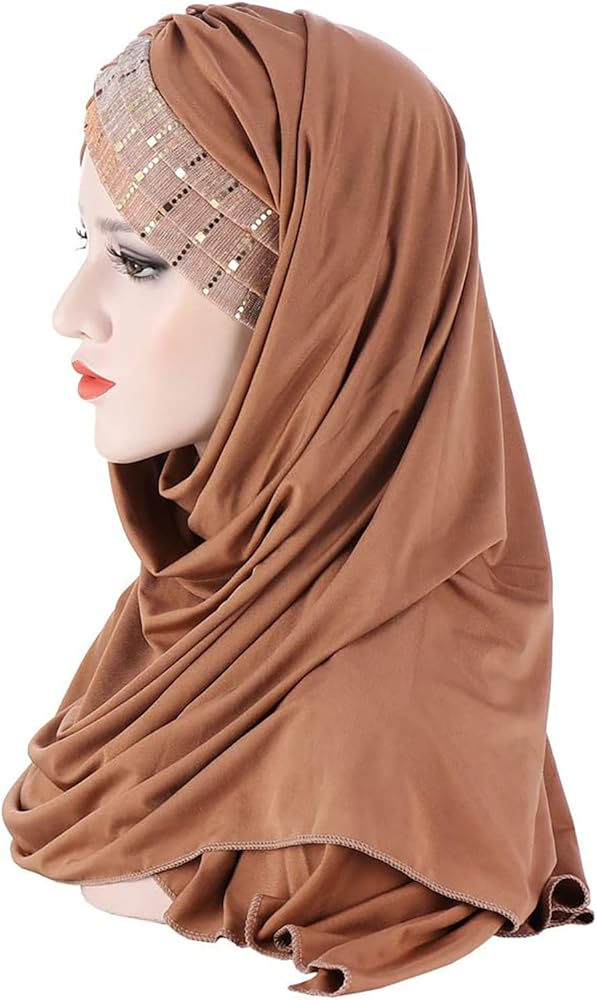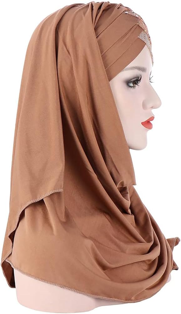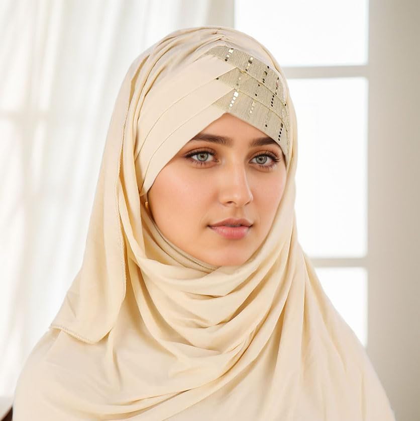 غطاء رأس إسلامي حجاب مزين بالترتر، وشاح بلون موحد خفيف الوزن وطويل وقابل للتعديل غطاء رأس مرن قابل للتمدد للنساء (بيج)