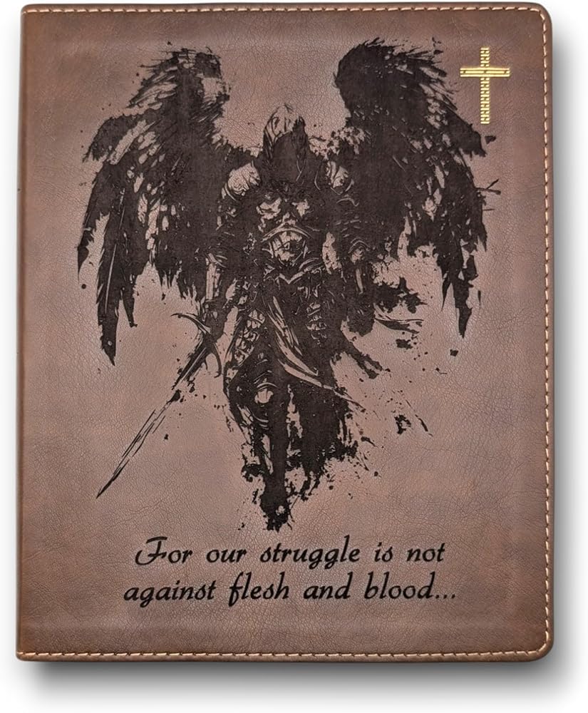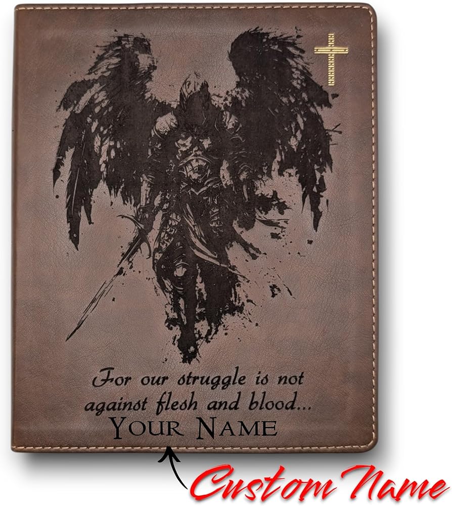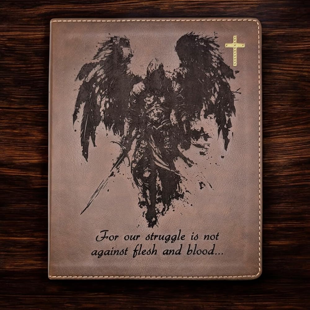 This Personalized NIV Journal Bible is custom engraved with the powerful image of Michael the Archangel, protector and spiritual warrior. Featuring the iconic verse from Ephesians 6:12: “For our struggle is not against flesh and blood...” This Bible is a bold reminder of the unseen battles we face and the strength found in Christ. The New International Version text offers clear, easy-to-read scripture, perfect for personal study, reflection, and meditation. The added journaling space provides the opportunity to document your spiritual journey, prayers, and insights. Perfect for any occasion, this Bible makes a meaningful and unique gift for baptisms, weddings, birthdays, graduations or spiritual milestones. Its custom engraving adds a personal touch, turning it into a one-of-a-kind gift that speaks directly to the recipient's heart.