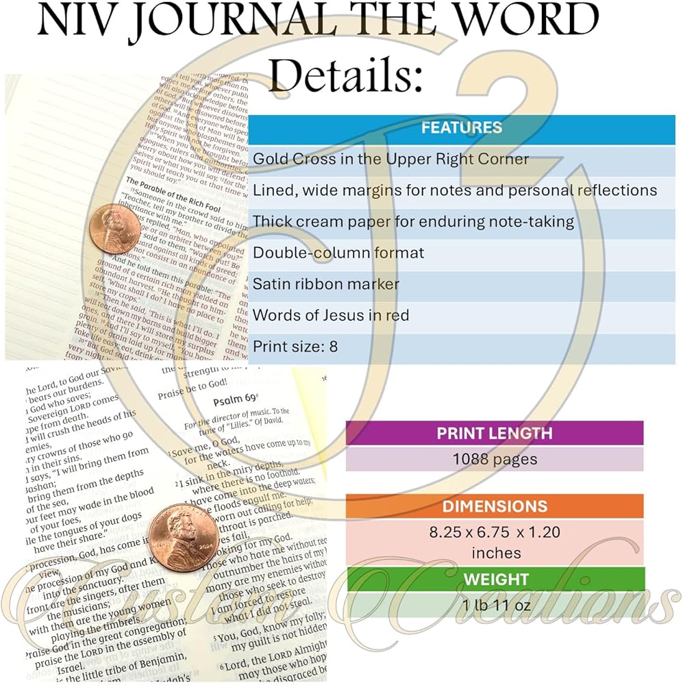 Bible Details - NIV Journaling Bible | Brown faux leather with a Gold Cross in Upper Right Corner | New International Version | Length - 8.25” | Width - 6.75” | Thickness - 1.20” | Font - 8 pt.