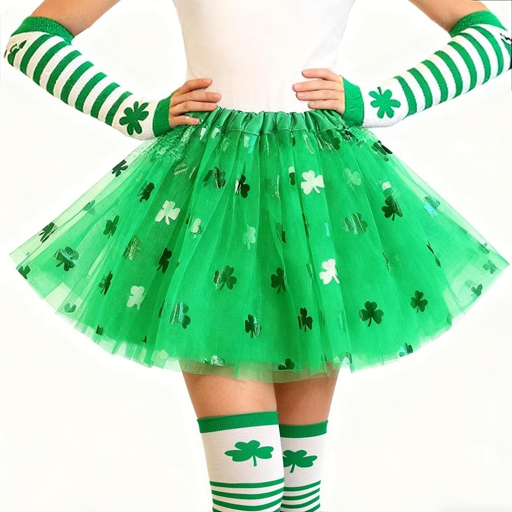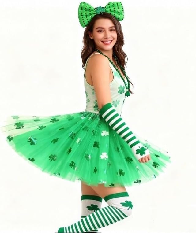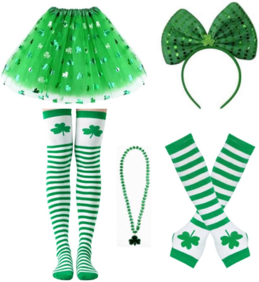 5PCS St. Patrick's Day set: This St. Patrick's Day costume set includes 1 piece of green tutu skirt, 1 pair of arm warmers, 1 pair of knee socks, 1 piece green bowtie headband, 1 piece shamrock necklace for a complete St. Patrick's Day ensemble