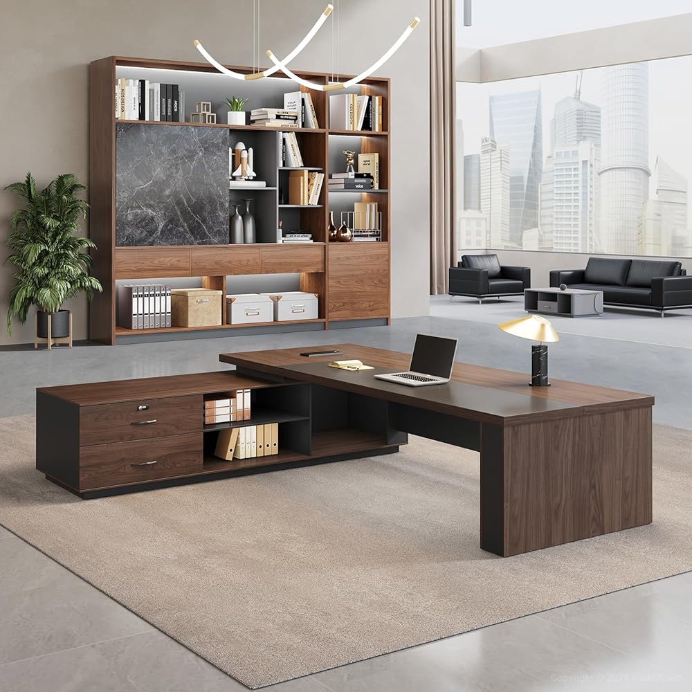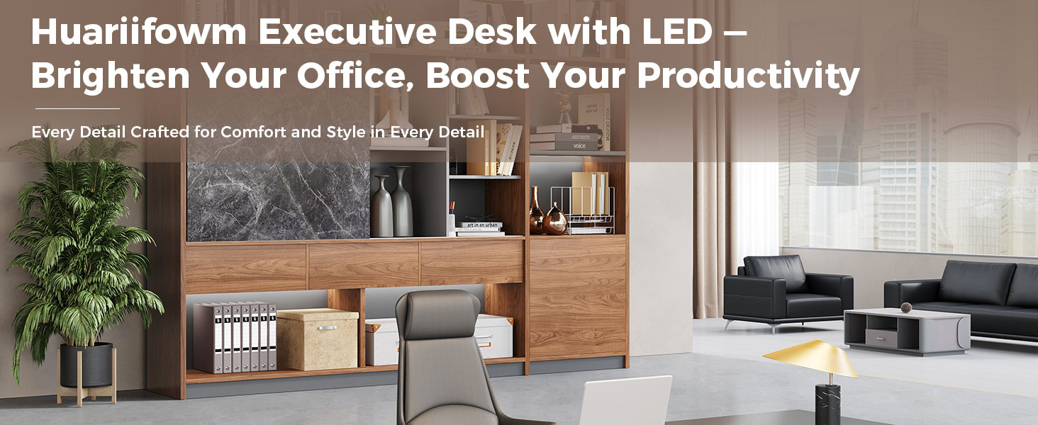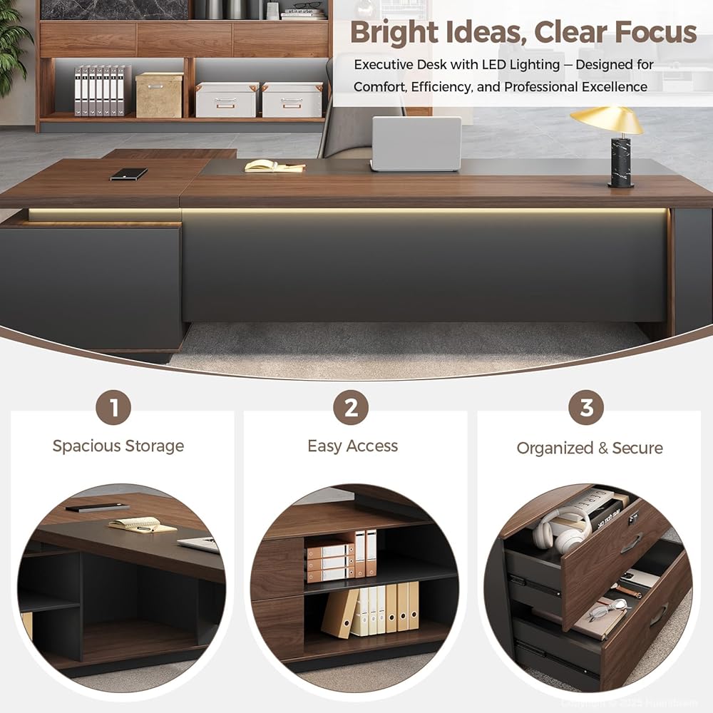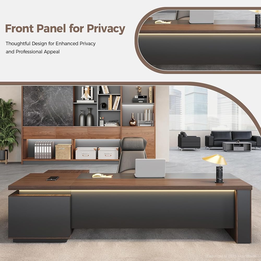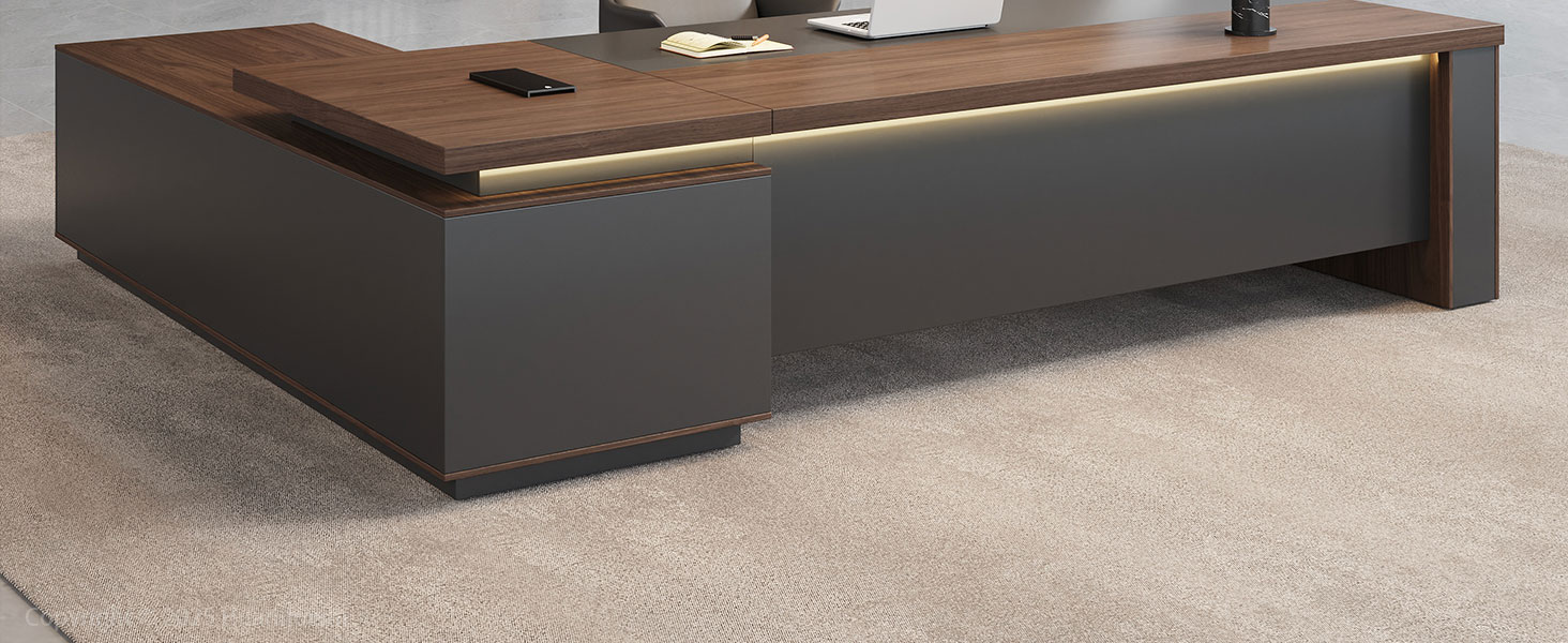 تصميم تنفيذي بأناقة عصرية، مصنوع من خشب الجوز الفاخر واللمسات النهائية باللون الرمادي الفحمي، يضيف هذا المكتب التنفيذي لمسة راقية إلى مكتبك. تعمل إضاءة LED المدمجة على رفع أجواء مساحة العمل - وهي مثالية للمديرين التنفيذيين والمديرين والمهنيين الذين يقدرون الجمال والسلطة.