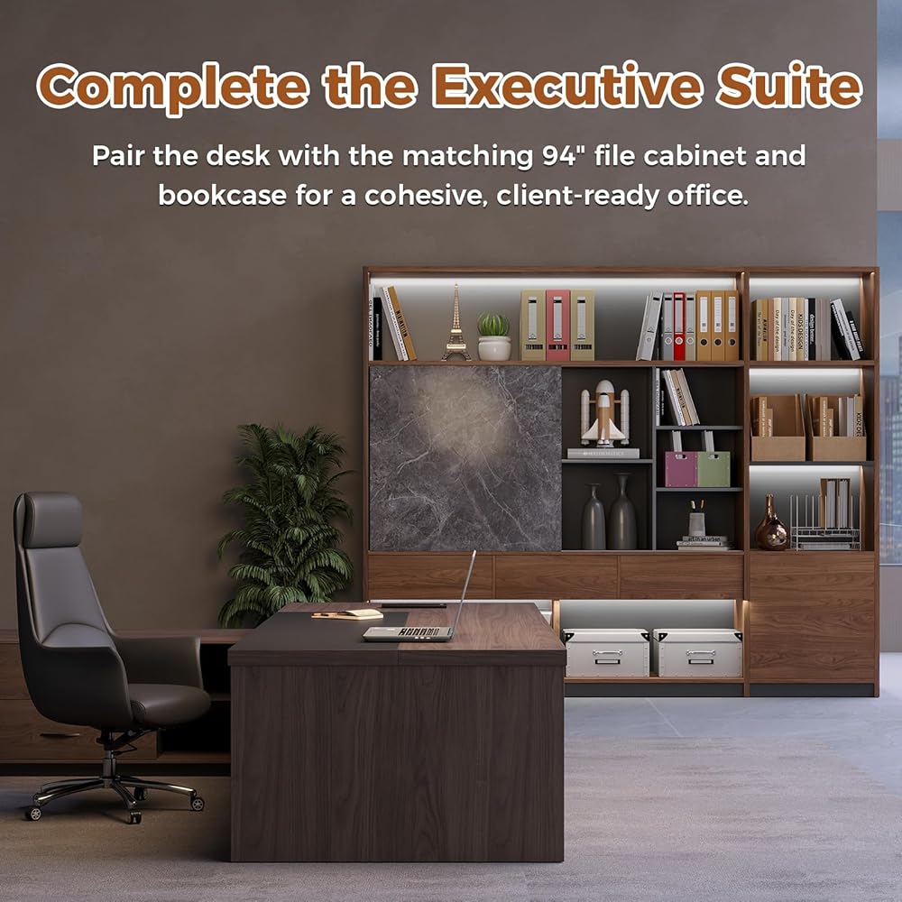 أكمل الجناح التنفيذي قم بإقران هذا المكتب التنفيذي على شكل حرف L مع خزانة الملفات وخزانة الكتب المتطابقة مقاس 94 بوصة بنفس اللون الجوزي والأردوازي لبناء مكتب تنفيذي متماسك يثير إعجاب العملاء ويحافظ على الملفات المهمة في متناول اليد.
