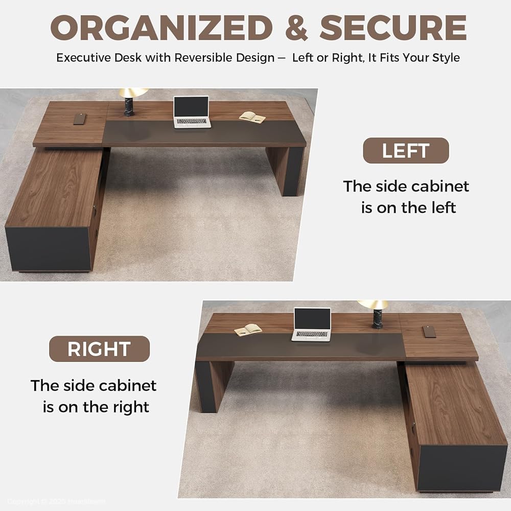 تصميم مرن على شكل حرف L — خزانة قابلة للعكس قم بتخصيص الإعداد الخاص بك باستخدام خزانة جانبية قابلة للعكس تناسب المستخدمين الذين يستخدمون اليد اليسرى واليمنى. قم بتكييف التصميم مع تصميم غرفتك وسير العمل لتحقيق أقصى قدر من الراحة والكفاءة.