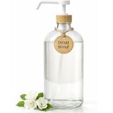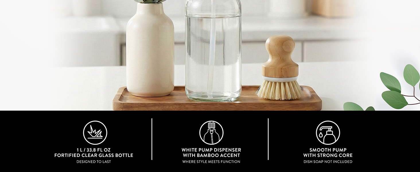 وداعًا للبلاستيك الذي يستخدم مرة واحدة - استمتع بالاستدامة الأنيقة مع مجموعة موزع صابون المطبخ المصنوعة من الزجاج الشفاف بسعة 34 أونصة سائلة / 1 لتر. ممتاز ومتين، للاستخدام اليومي وسهل إعادة تعبئته. يمكن استخدامه أيضًا كمجموعة موزع لوشن وصابون الحمام.