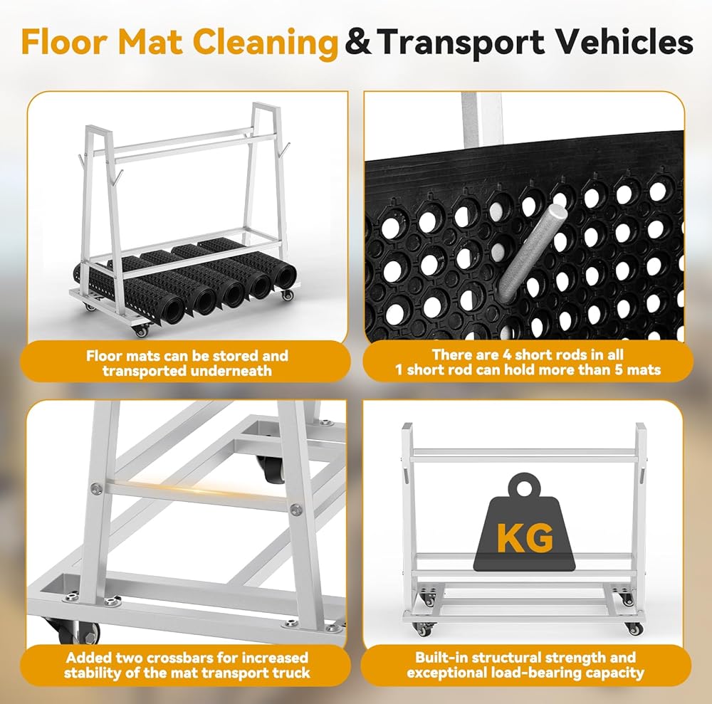 Efficient Transportation: The mat transporter easily moves multiple mats to cleaning areas at once, streamlining your maintenance routine