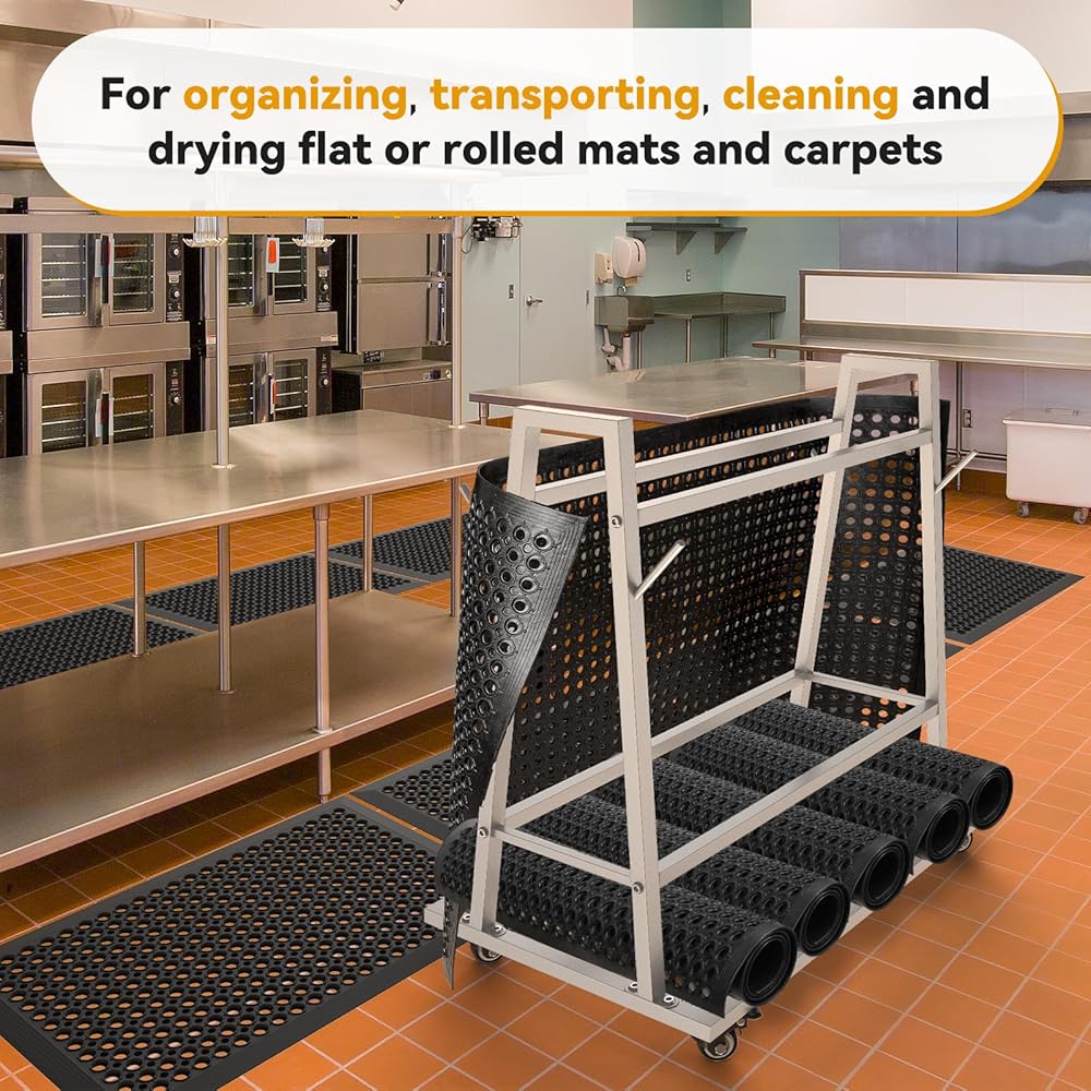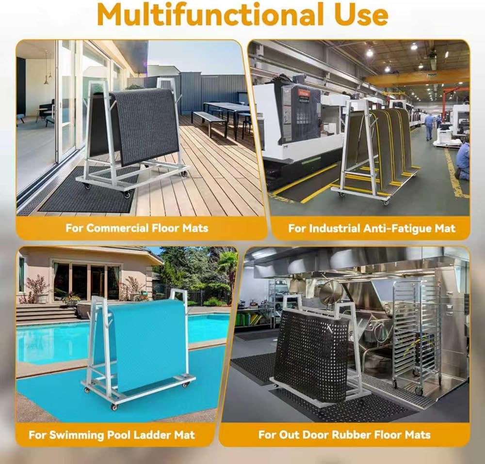 Broad Applicability: The mat cart is designed for transporting a wide range of mats, including outdoor mats, anti-fatigue industrial mats, anti-slip drainage mats, and commercial mats