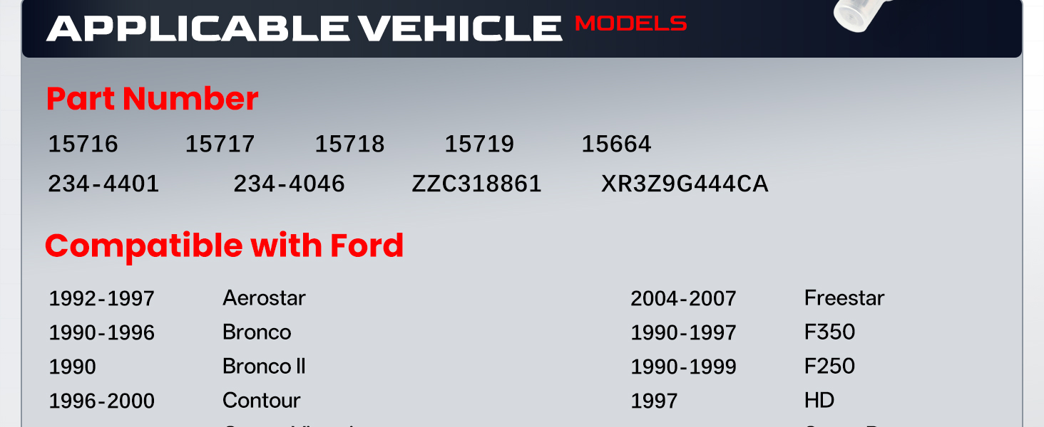 • رقم OE المرجعي: 15716، 15717، 15718، 15719، ZZC318861، XR3Z9G444CA، 15664، 234-4401، 234-4046