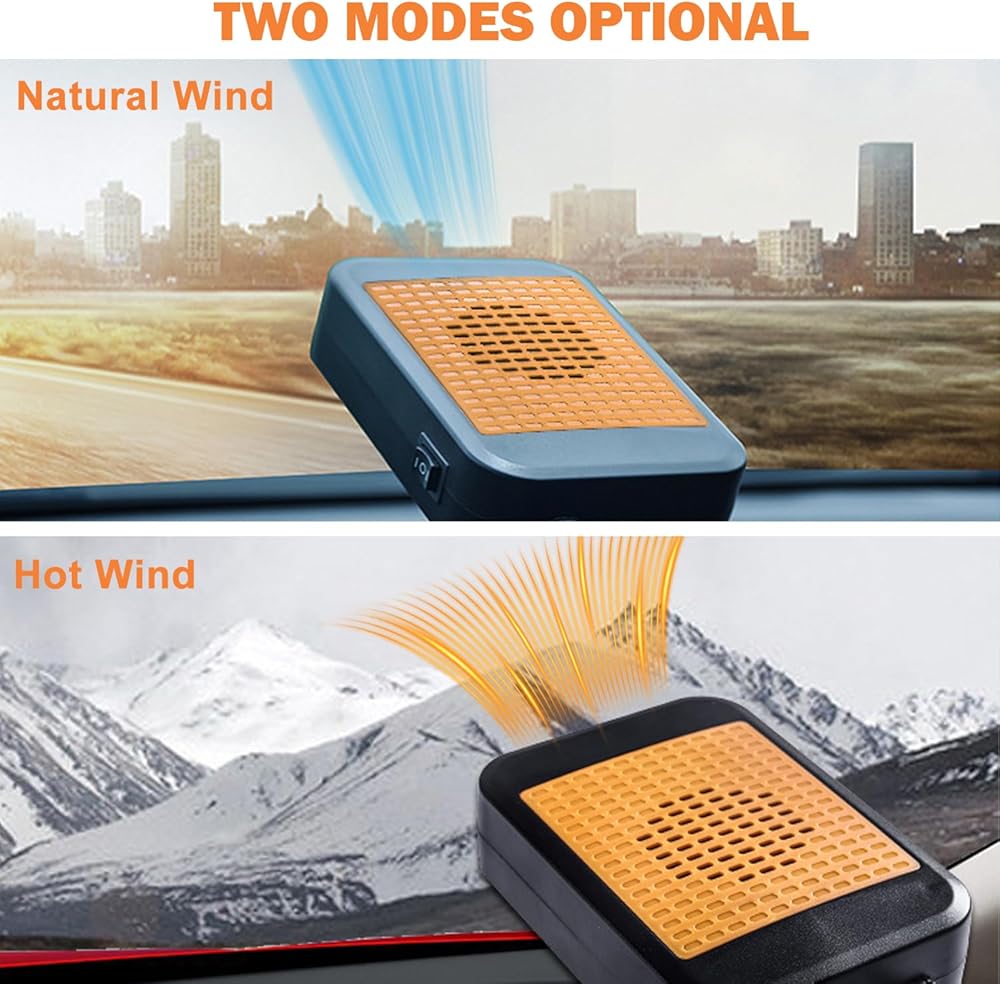 【2-in-1 Modes】Dual-function design works as a heater for winter defrosting/heating and a cooling fan for summer ventilation. Meets year-round driving comfort needs with simple mode switching.