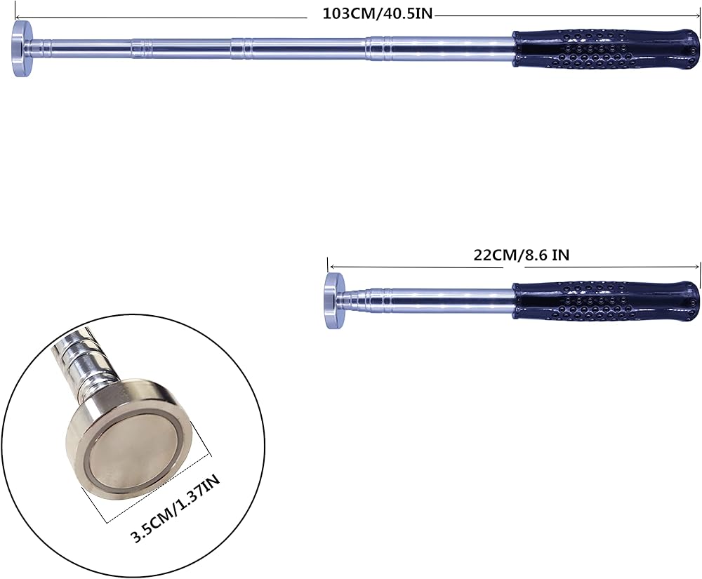 • 35 pound strong suction magnetic pickup, with 6 telescopic tubes on the handle and dual safety jaws on the handle. Not easy to break, sturdy and durable. Product packaging weight 0.39lb.Extends up 8.8" to 41". Foam comfort grip for easy operation and control. Durable stainless steel construction.Pick up sticks that great to use in classroom, garage, home, office, workshop, yard, and more!