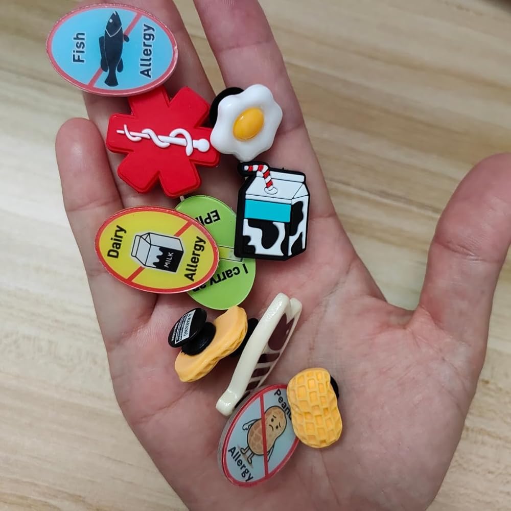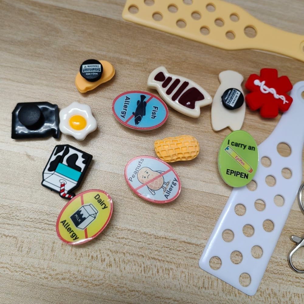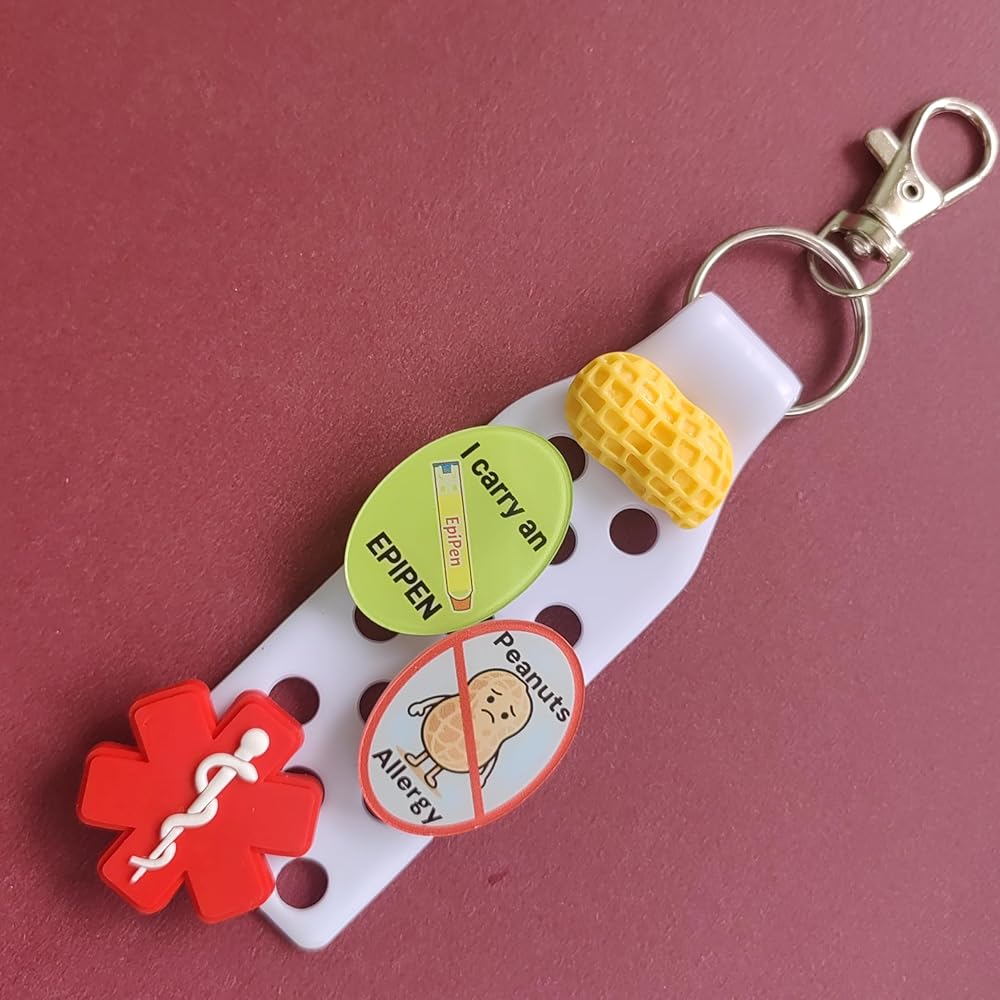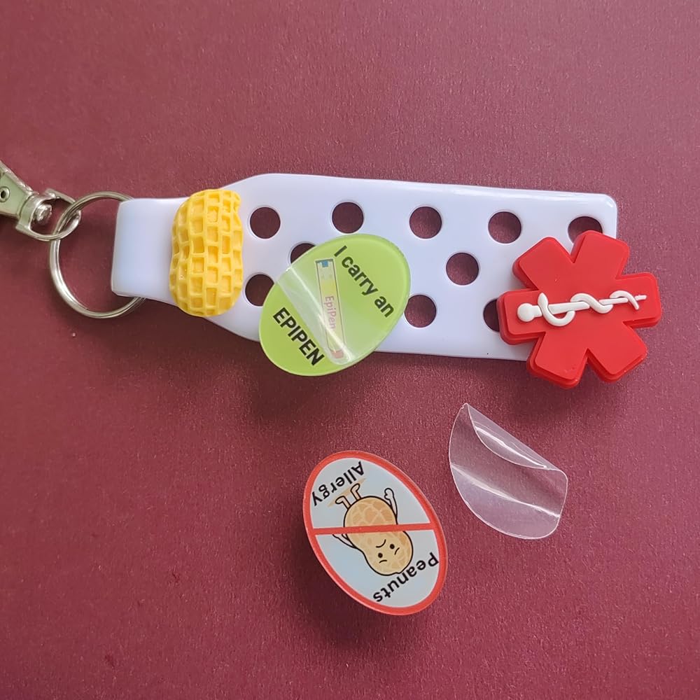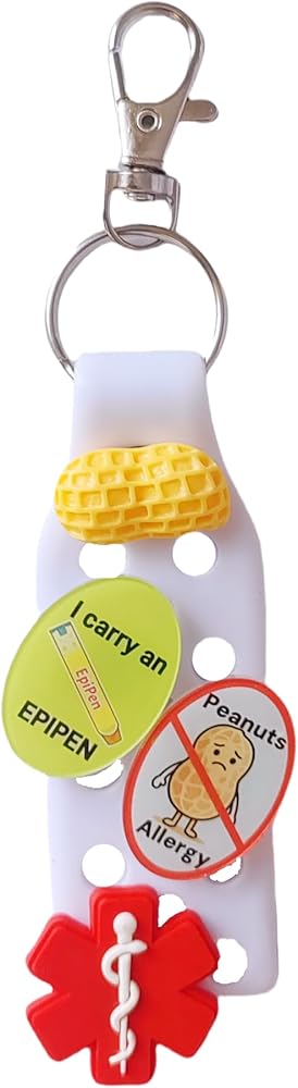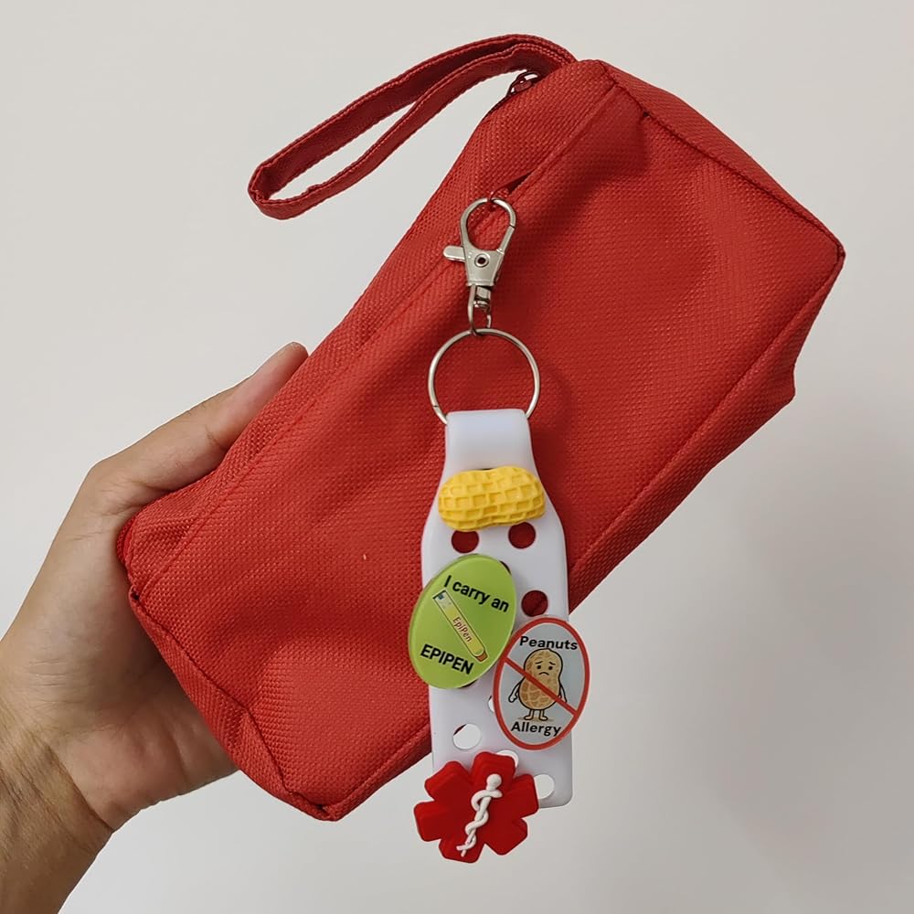 Stay prepared for emergencies with this practical medical alert keychain featuring essential ID tags. The durable keychain comes with a convenient clip attachment and includes multiple medical identification components - a peanut allergy alert tag, An oval acrylic accessory printed with the inscription "I CARRY AN EPIPEN INSIDE", and a universal medical symbol. The bright red medical symbol ensures first responders can quickly identify medical information in an emergency. The peanut allergy tag features a clear symbol and text for immediate recognition. This compact yet comprehensive medical ID system is perfect for those who need to carry emergency medication and want to clearly communicate their medical needs. The sturdy construction and secure clasping mechanism help keep your vital medical supplies and information safely attached to your keys or bag.