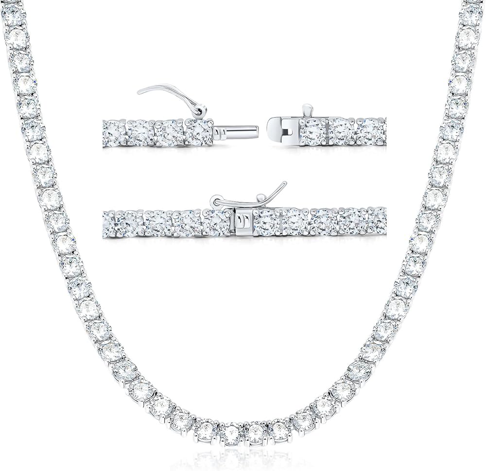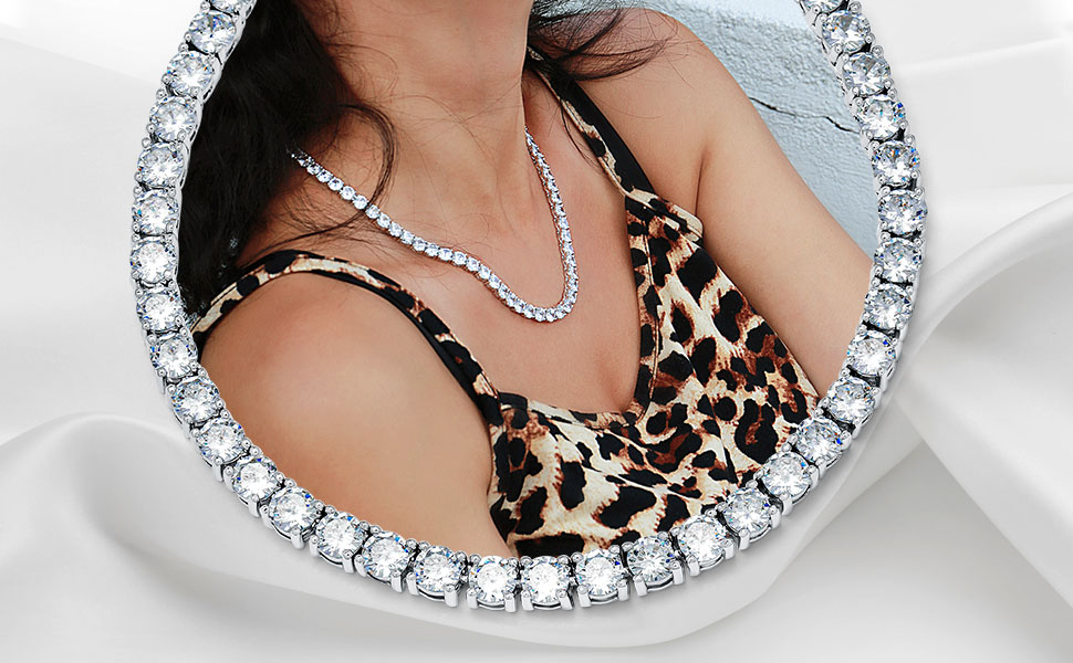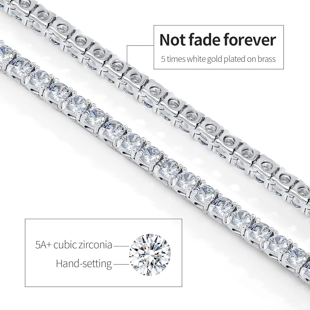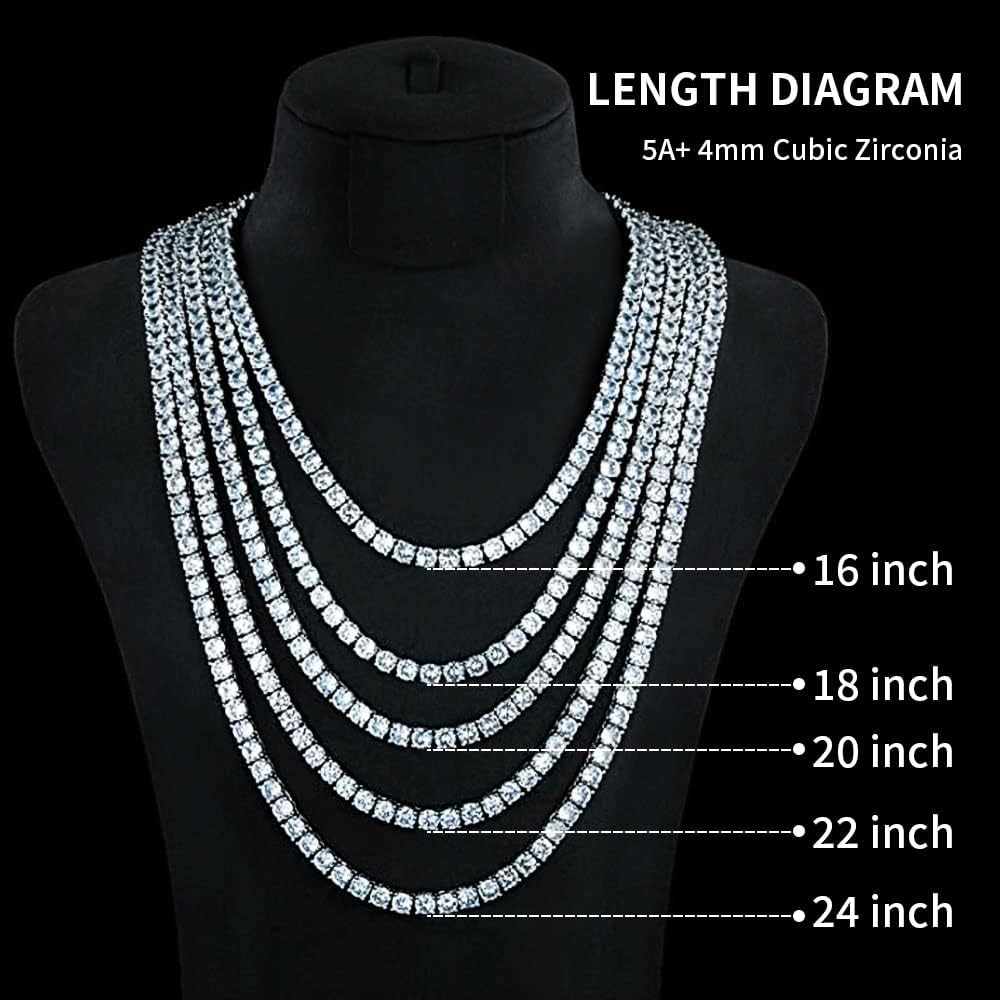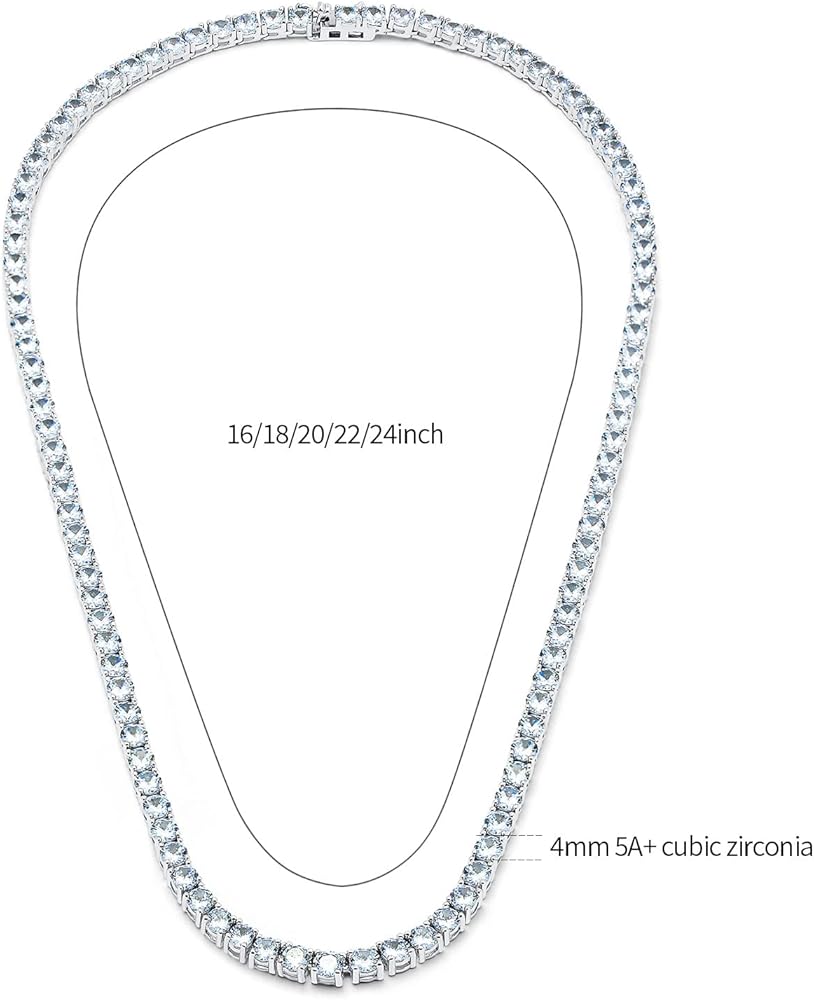 قلادة التنس ذات 4 شقوق سلسلة ألماس من النحاس المطلي بالذهب الأبيض عيار 18 قيراط. قطر الماس: 4 مم. طول سلسلة القلادة: 16/18/20/22/24 بوصة، مع قفل صندوق مزلاج آمن.