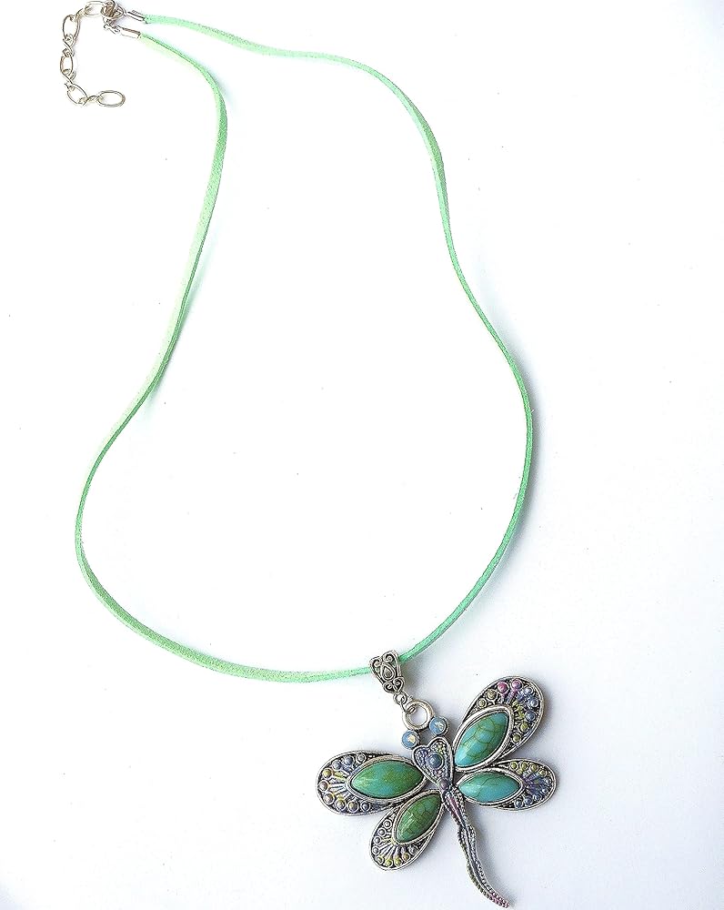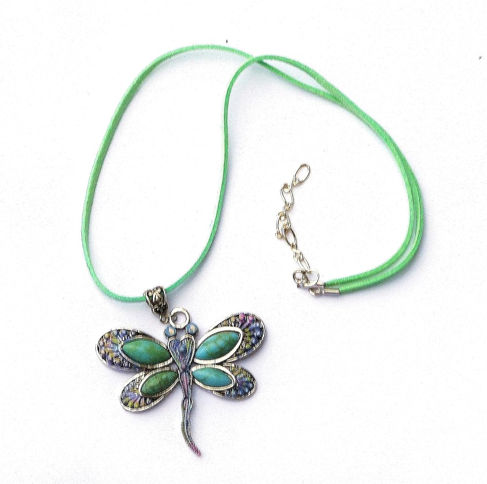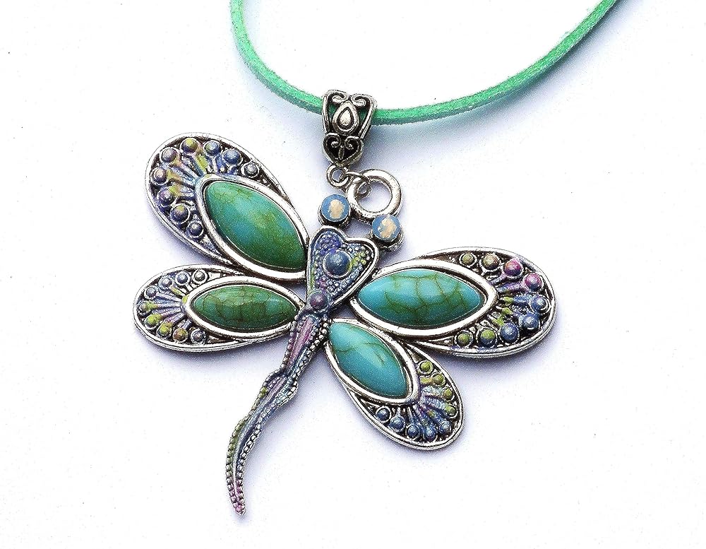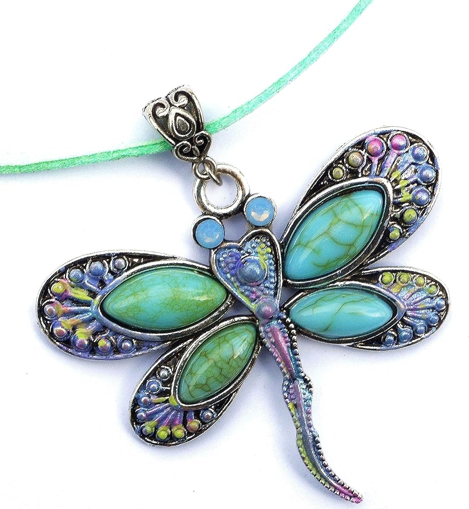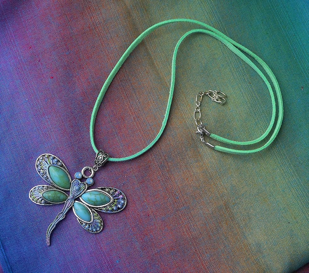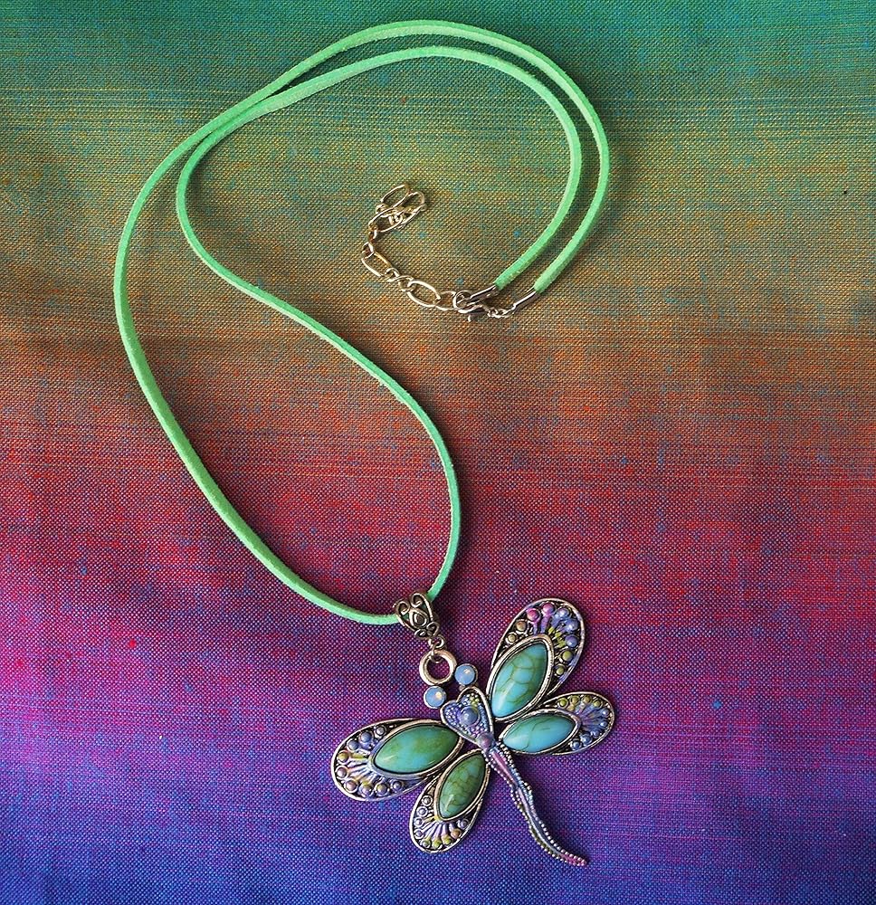 A large and vibrant silver dragonfly pendant with turquoise, violet, & pink painted accents and opalescent crystal eyes dangles from a green-blue faux leather suede cord necklace! It's the perfect statement necklace to add stunning Boho style to your outfits all year long! And the necklace is adjustable...it comes with an extender chain so you can wear it a bit longer when you want to! Faux Suede Leather Necklace w/ Lobster Clasp, 20" w/ 2" extender chain, Silver-plated Dragonfly Pendant w/ Faux Turquoise Stones, 2 1/4" high, 2 1/4" wide