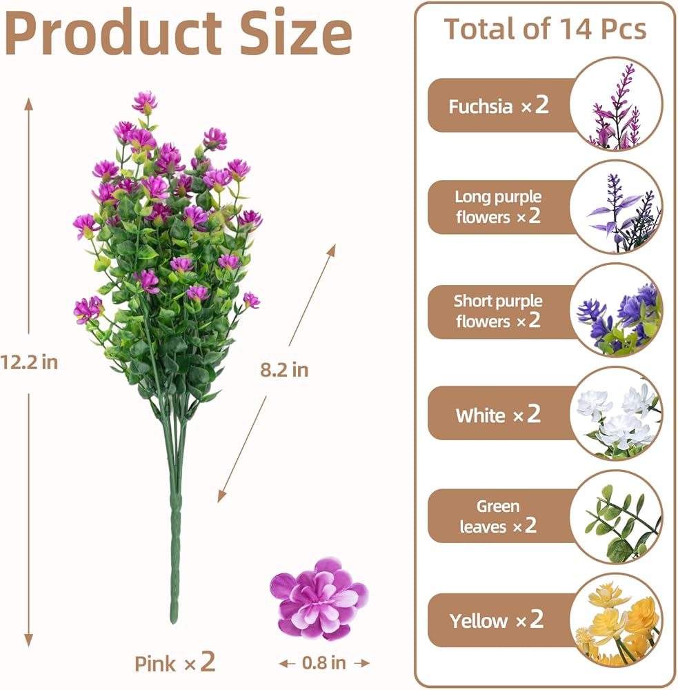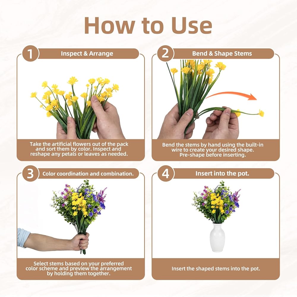 ترتيب سهل: تحتوي سيقان الزهور المزيفة في الهواء الطلق على أسلاك مرنة مدمجة يمكن ثنيها بسهولة لتصميم الأزهار. ليست هناك حاجة لأي أدوات - ما عليك سوى ثنيها وإدخالها في المزهريات أو الأواني أو المزارع لإنشاء تنسيقات زهور أو أكاليل أو زخارف للممرات مخصصة دون عناء، مما يضفي الحيوية على رؤية حديقتك.
