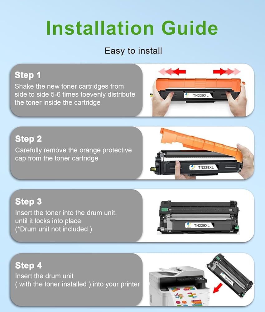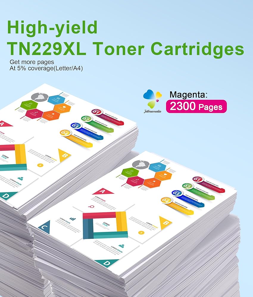 【حبر عالي الإنتاجية】خرطوشة حبر TN229XL عالية الإنتاجية تصل إلى 2300 صفحة لكل خراطيش حبر أرجواني TN229XL بتغطية 5% من ورق A4. يضمن الحبر المصمم حصريًا حيوية الألوان الزاهية والمطبوعات الحادة التي تدوم طويلاً