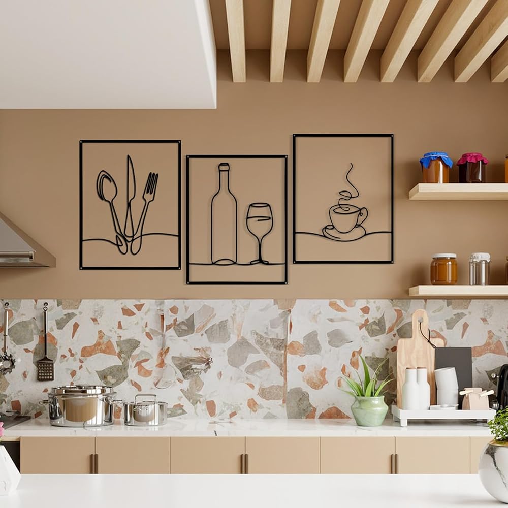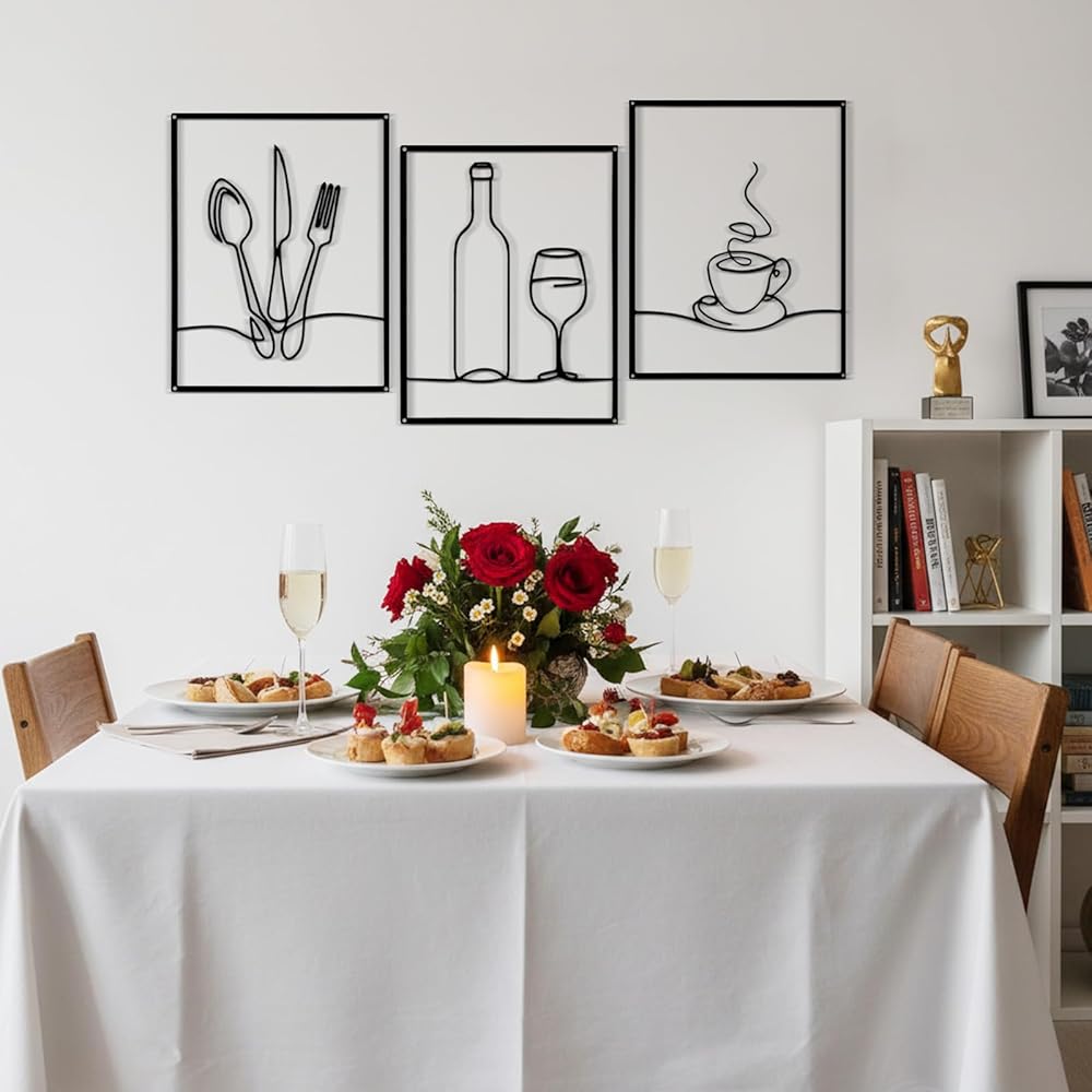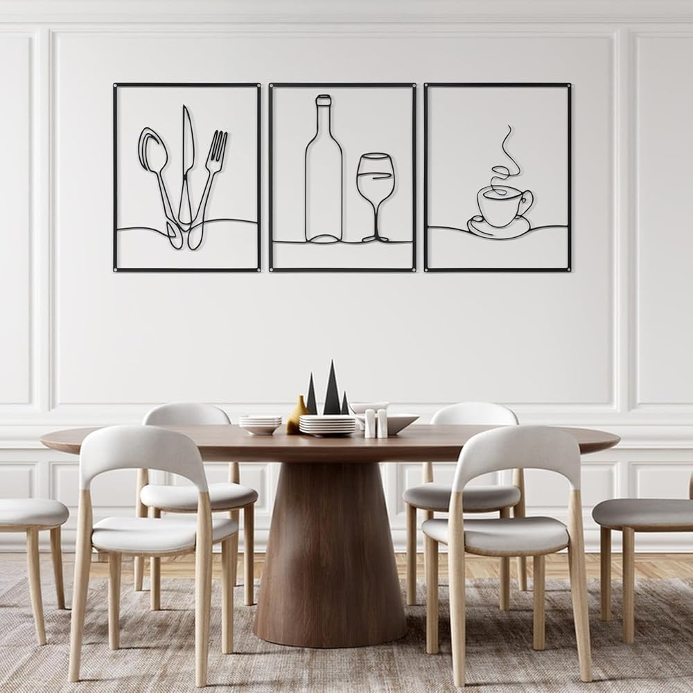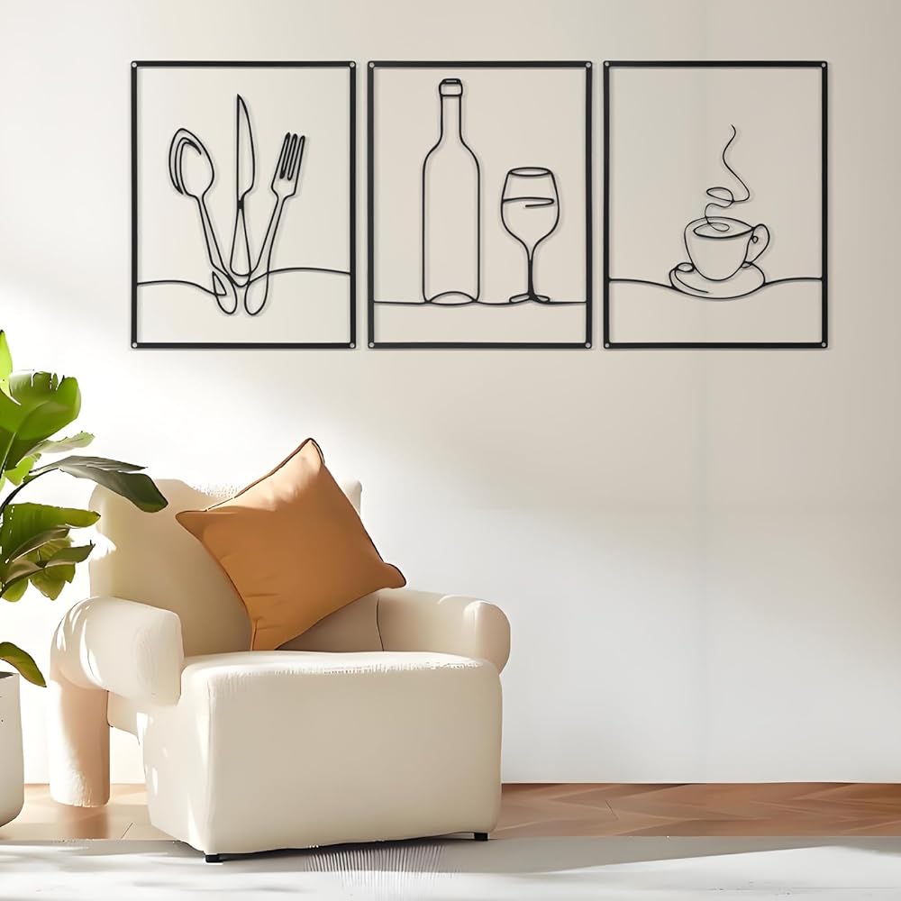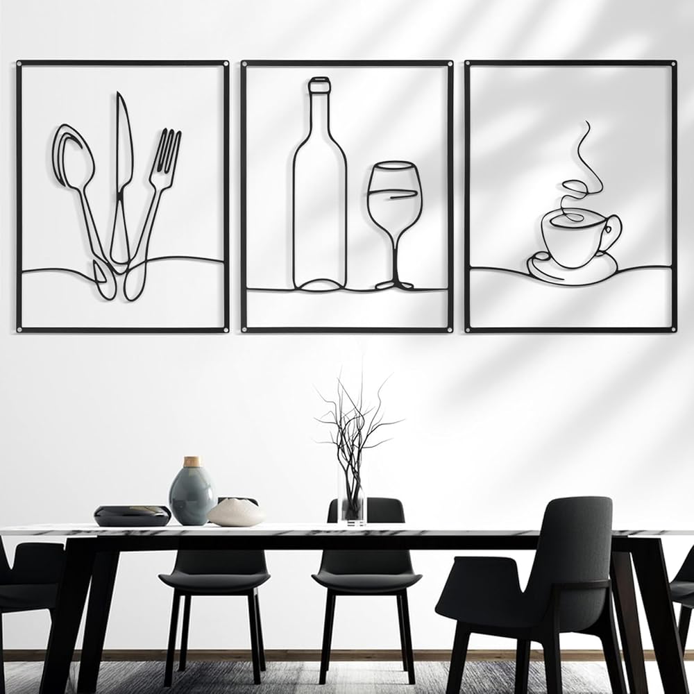 Afcabakila 3 Pcs Metal Wall Art, Wall Decor for Dining Room, 14 x 11 Inch Rustic Kitchen Decor, Minimalist Line Kitchen Walls Art for Home, Living Room & Housewarming Gifts (Black)