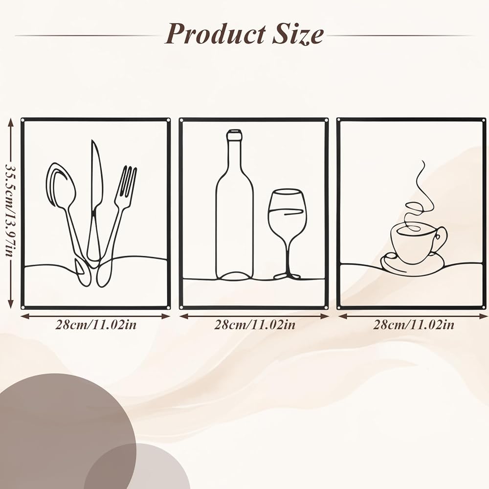 • Modern Kitchen Transformation: Our kitchen wall decor package includes 3 pre-hung metal art pieces with protective coating, effortlessly upgrading your cooking space into an inspirational and stylish area - perfect for dining room wall art enthusiasts seeking cohesive design