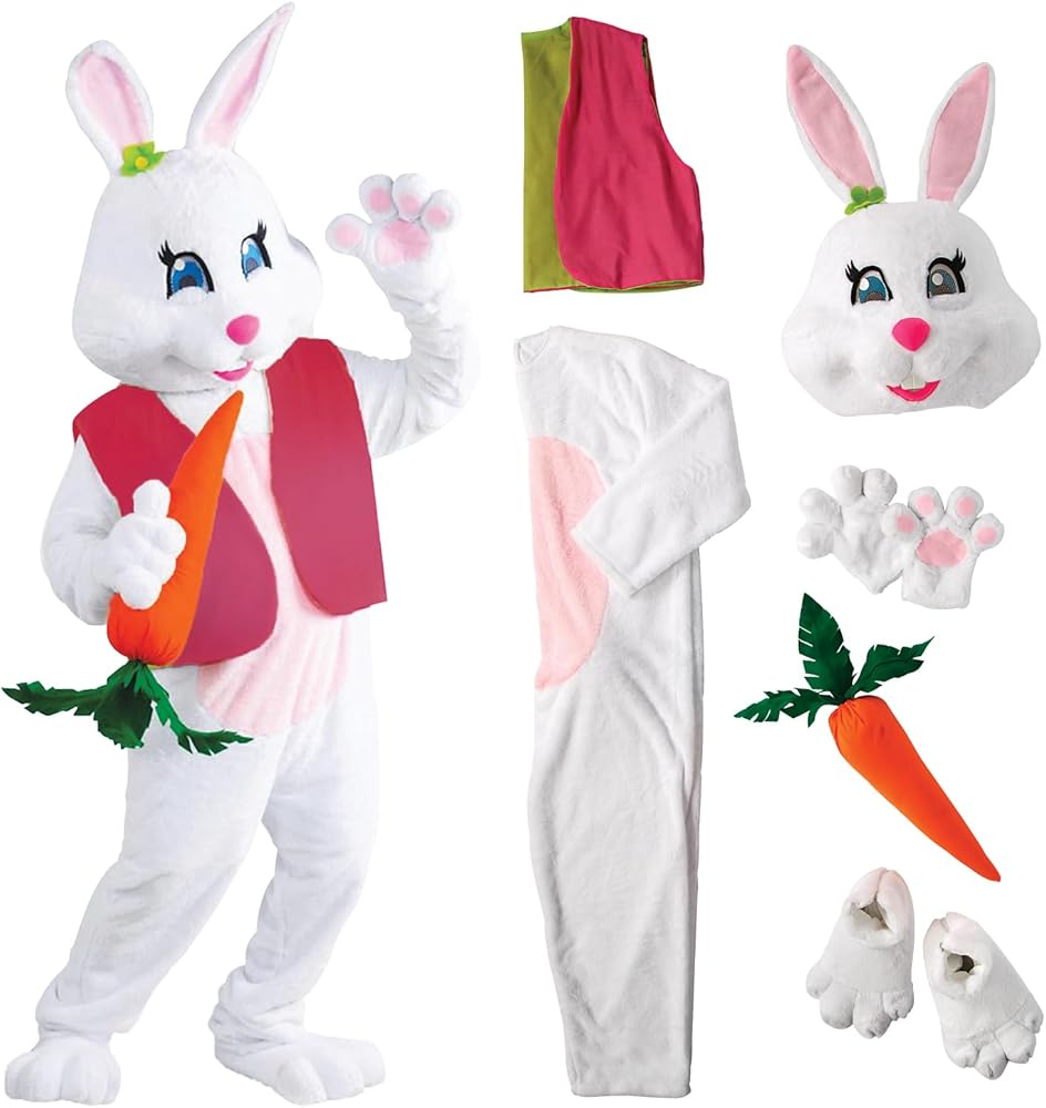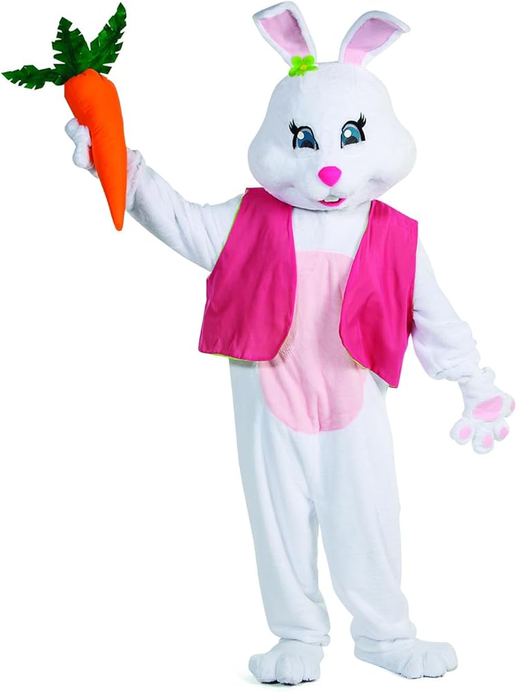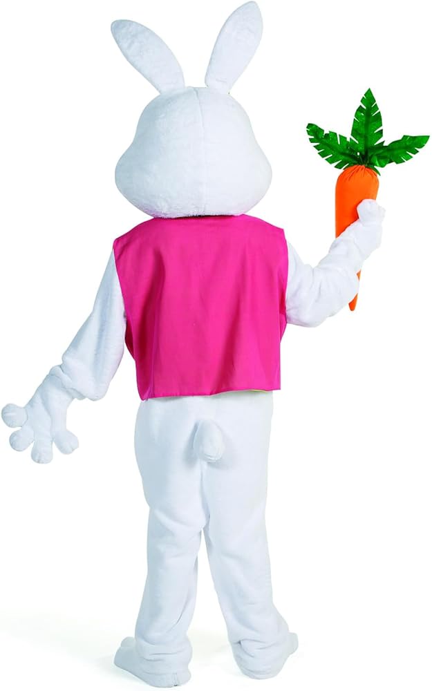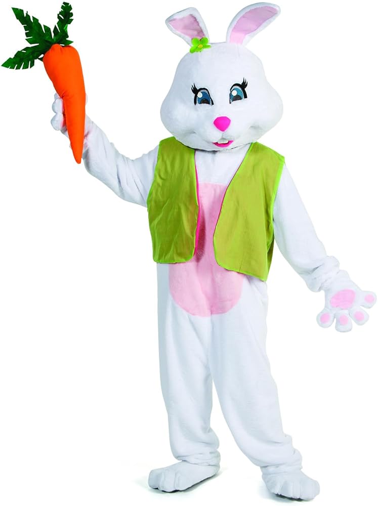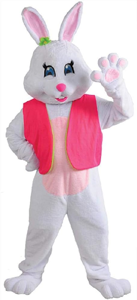 An Affordable Choice in Easter Costumes: Celebrate your Easter Party with a Professional Look! A Vibrant soft plush costume is a fun entertaining way to kick-off Spring! • Featuring an Easy to wear full body jumpsuit w/ oversized Bunny Head • Character Head has a foam rubber ring inside with cloth cap to secure head in place, allowing for natural movement • Feminine Eyes • Reversible Green/Pink Vest • Big Comfortable Gloves reaching 11 inches from wrist to finger tips • Fluffy Detachable Tail• 14in Foam Stuffed Feet w/ No Slip Sole • Long Soft Rabbit Ears reaching 13 inches tall • A Removable faux Flower • Includes a FREE Oversized Soft plush Carrot Whether its making a lasting impression with guests, stirring up comments on social media, or promoting person events, this costume has it all! Bunny suit can be stored and reused providing years of entertainment. Easy assembly in just a few simple steps! Fits sizes up to 42 (Inseam length is approximately 31 inches, sleeve length from shoulder seam to wrist is 29 inches, with length from center back to wrist 39 inches) Care Instructions: Suit--Hand wash cold, line dry or dry clean. Do not bleach, do not tumble dry. Head-spot clean with damp sponge, and allow to dry. 100% polyester costume.