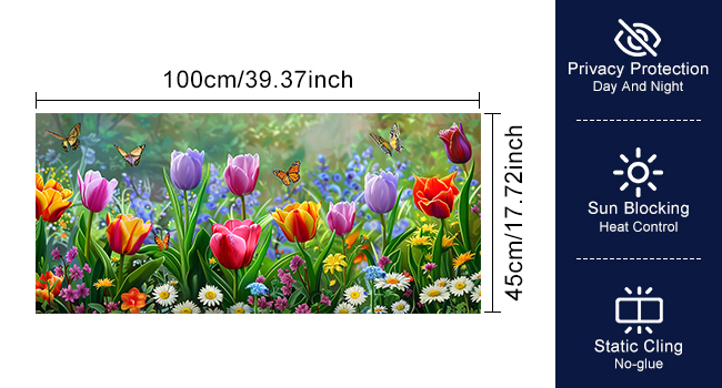 • 【تصميم حديقة الربيع】 يتميز بأزهار التيوليب والفراشات النابضة بالحياة، يجلب غشاء النافذة هذا ذو الطابع الربيعي البهجة الموسمية وسحر الأزهار إلى حمامك أو مطبخك أو لوحات الدخول الزجاجية.