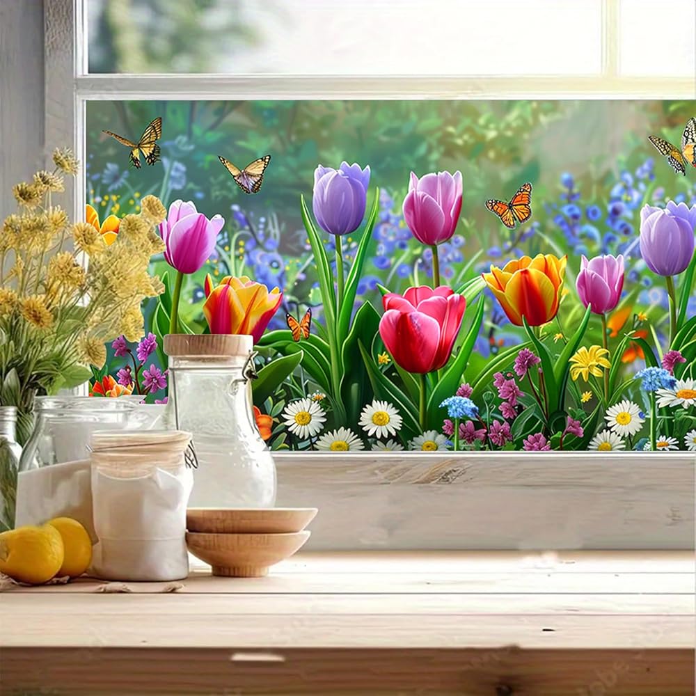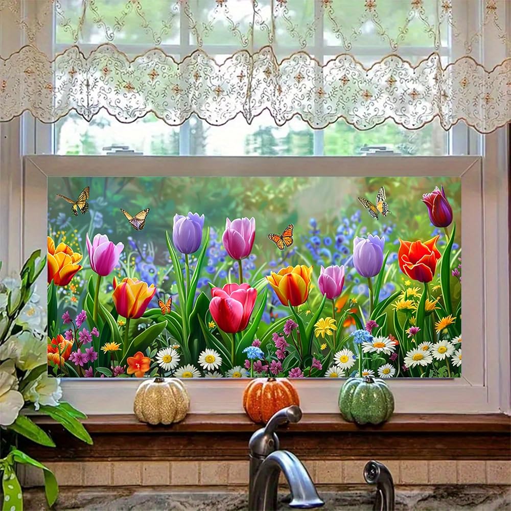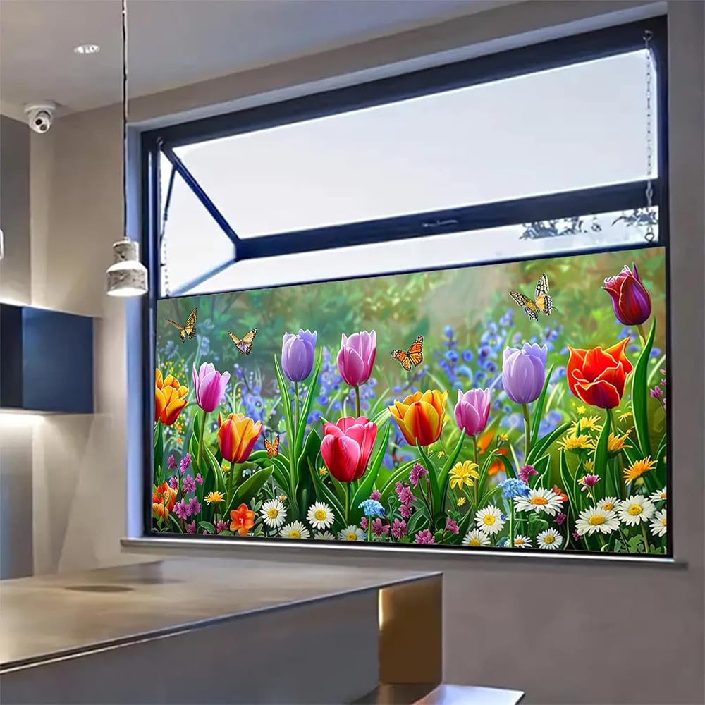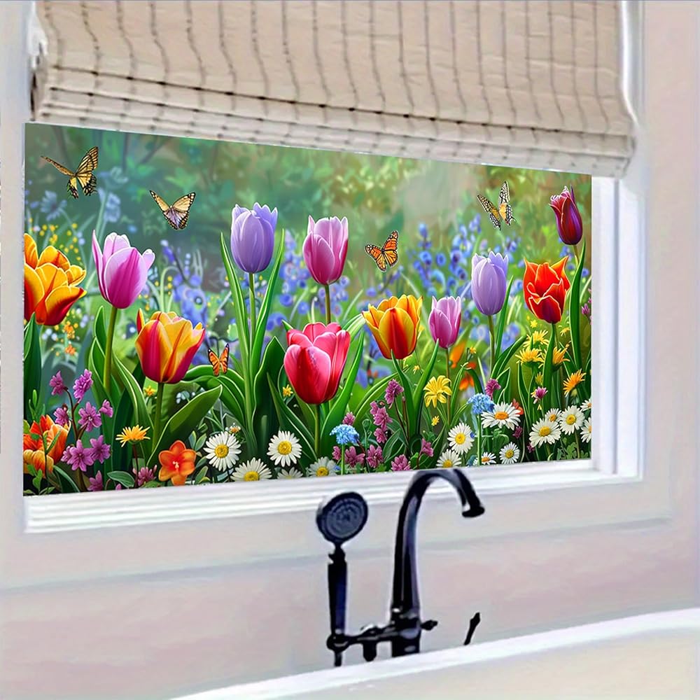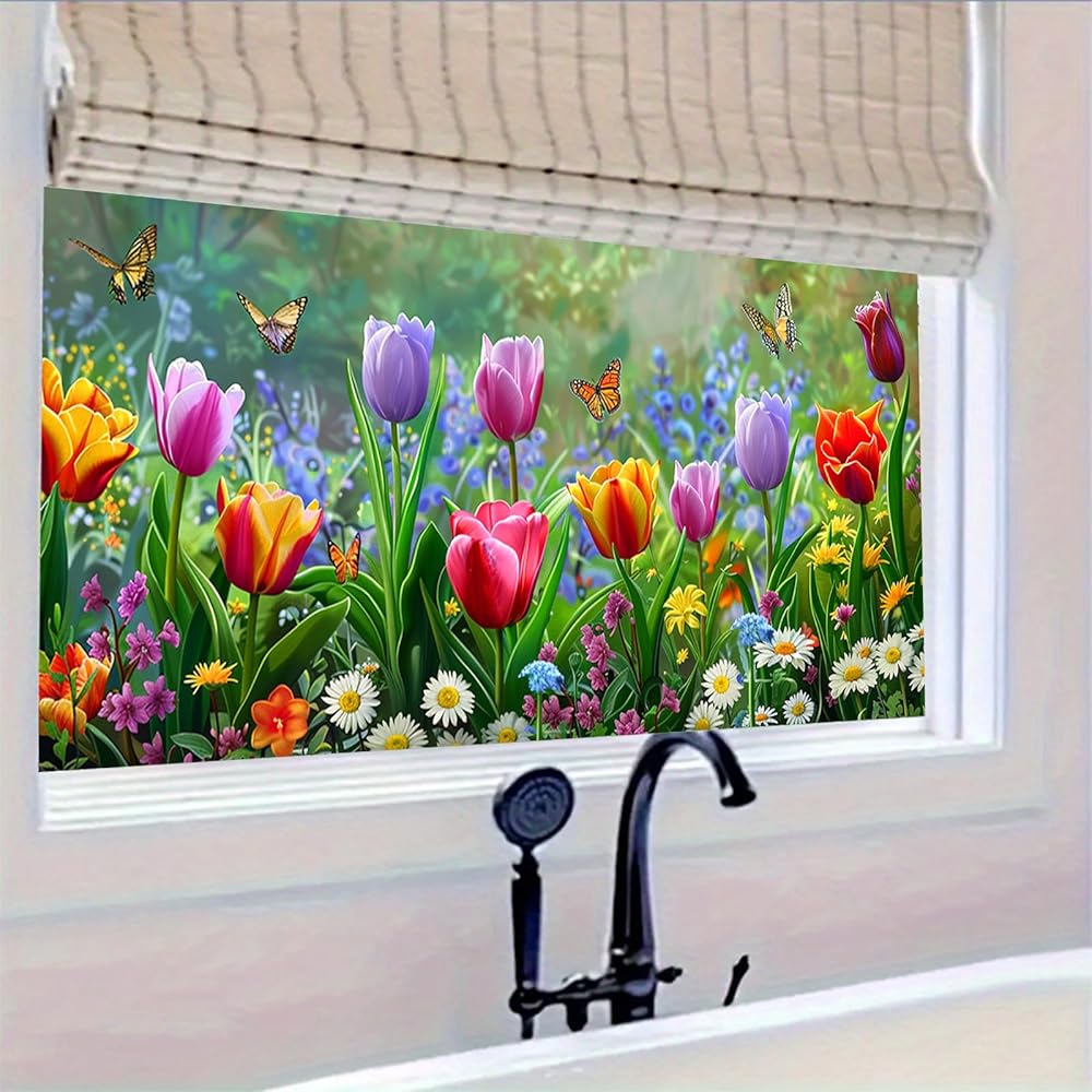 غشاء نافذة على شكل فراشة توليب مقاس 39.3 × 17.7 بوصة ملصق نافذة مزخرف بالزهور الربيعية، طبقة لاصقة ثابتة للنافذة للخصوصية للألواح الزجاجية والباب الأمامي والمطبخ والحمام