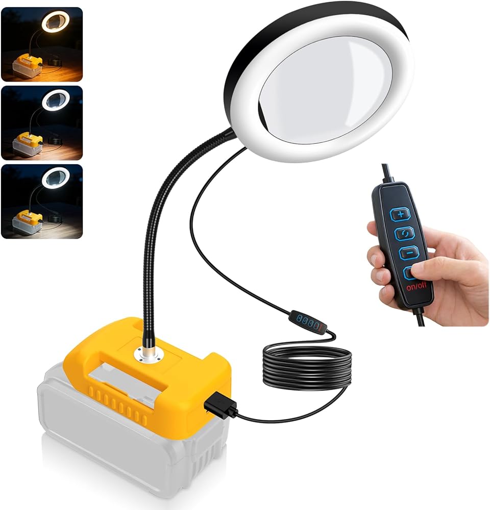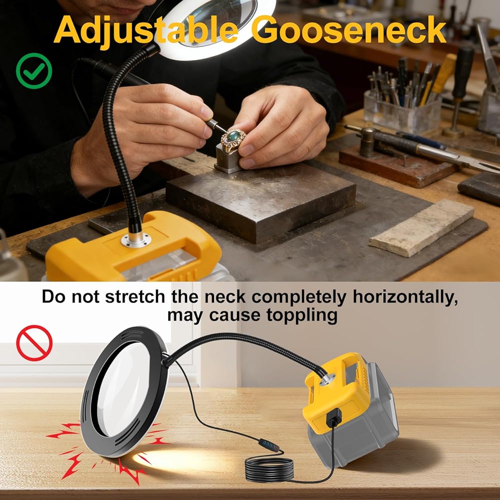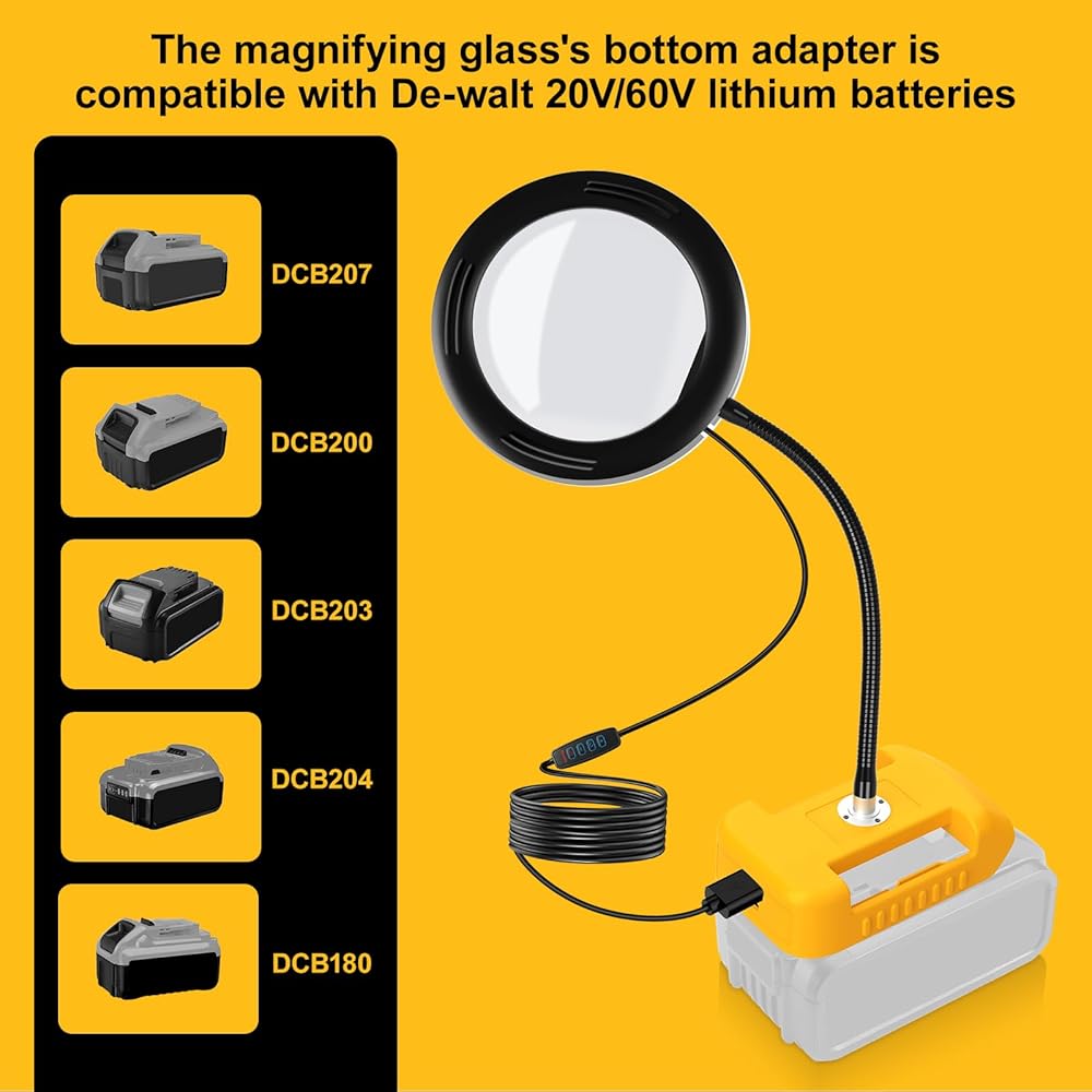 Attention Please: This magnifying glass's lower adapter interface is only compatible with Dewalt 18V/20V/60V lithium ion batteries, but battery is not included in the package. the glass needs the battery to provide energy