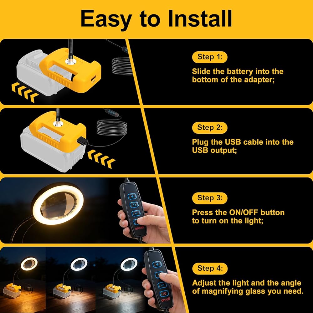 Easy to Install and Use: Comes almost assembled, just requires your dewolt batteries (not included). Easy to operate with a simple ON / OFF button switch, making it perfect for the elderly or those requiring an intuitive magnification system.