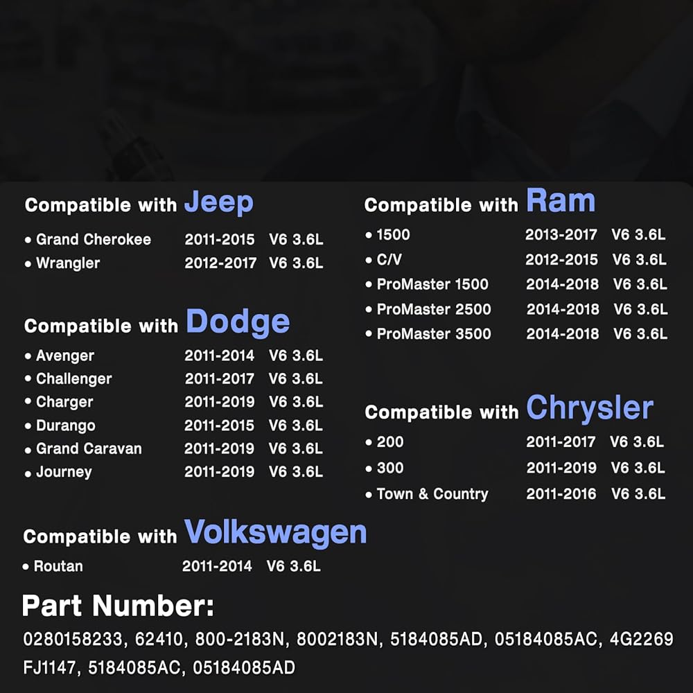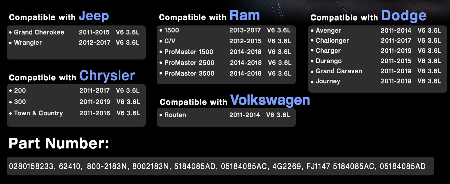 [تركيب السيارة] متوافق مع جيب جراند شيروكي (2011-2015)، رانجلر (2012-2017)، رانجلر JK(2018)؛ متوافق مع رام 1500 (2013-2017)، C/V (2012-2015)، ProMaster 1500 (2014-2018)، ProMaster 2500 (2014-2018)، ProMaster 3500 (2014-2018)؛ متوافق مع كرايسلر 200 (2011-2017)، 300 (2011-2019)، تاون آند كانتري (2011-2016)؛ متوافق مع دودج أفينجر (2011-2014)، تشالنجر (2011-2017)، تشارجر (2011-2019)، دورانجو (2011-2015)، جراند كارافان (2011-2019)، رحلة (2011-2019)؛ متوافق مع فولكس فاجن روتان (2011-2014) --- V6 3.6L. تحقق من الملاءمة عبر Amazon Garage لتجنب عدم التطابق قبل الشراء.