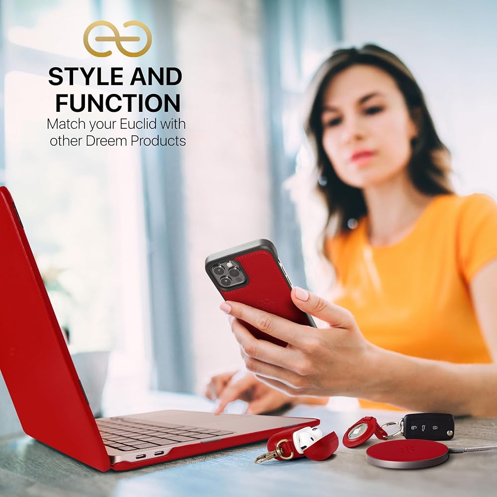 حافظة Dreem Euclid لجهاز MacBook Air - غطاء كمبيوتر محمول صلب مقاس 13 بوصة لجهاز MacBook Air 13 بوصة 2022-2025 (M2)، جلد نباتي فاخر، أغلفة علوية وسفلية للحماية، فتحات لمنافذ USB [أحمر]