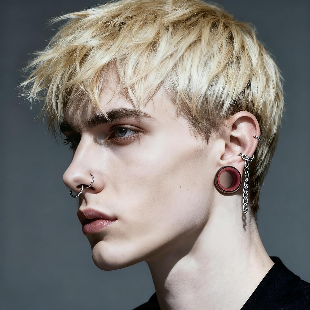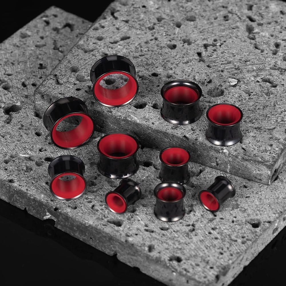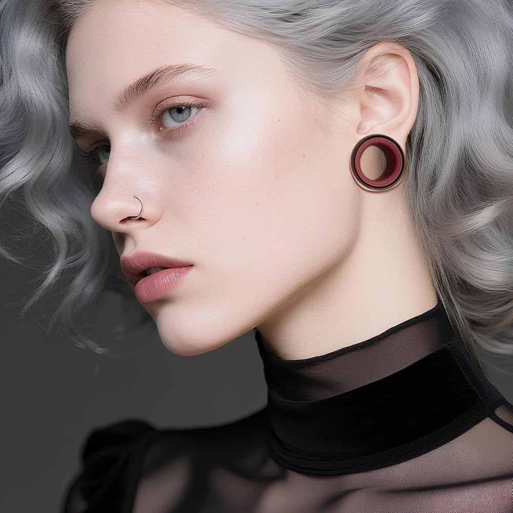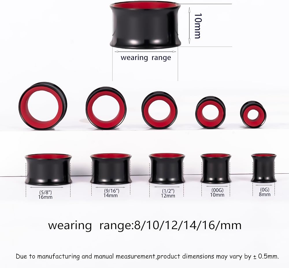 - خيارات الحجم: متوفرة بـ 8 مم (0 جم)، 10 مم (00 جم)، 12 مم (1/2 بوصة)، 14 مم (9/16 بوصة)، 16 مم (5/8 بوصة). تصميم متوهج مزدوج يناسب بشكل آمن الأذنين الممتدة.