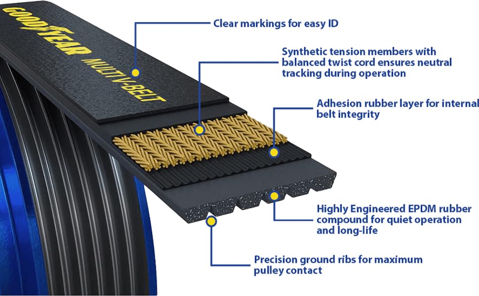 - Enhanced power transmission, reduced noise, and vibration with Goodyear Multi V Serpentine Belt with EPDM Rubber and Balanced Twist Polyester Cord