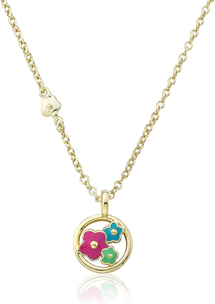 Little Miss Twin Stars Frosted Flowers14K Gold Plated Disc Pendant Accented With Multi Color Enamel Cut Out Flowers Chain Necklace/ 14" + 2"