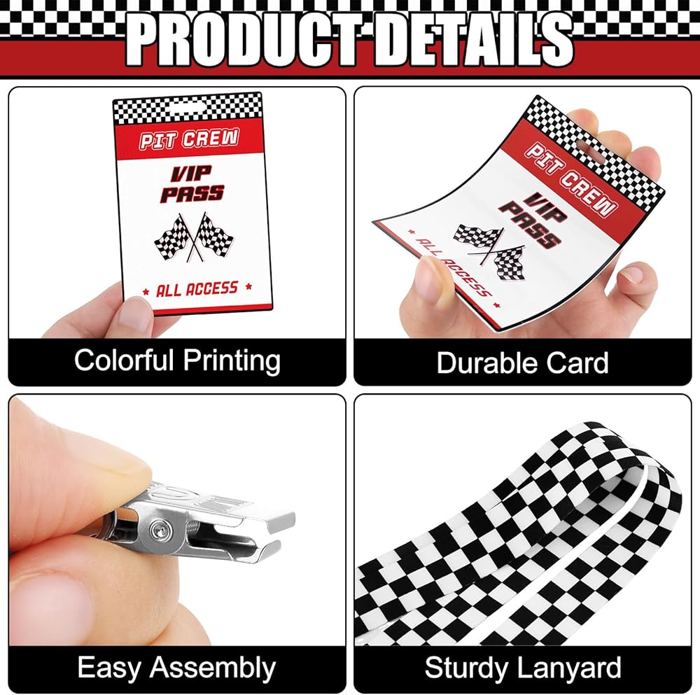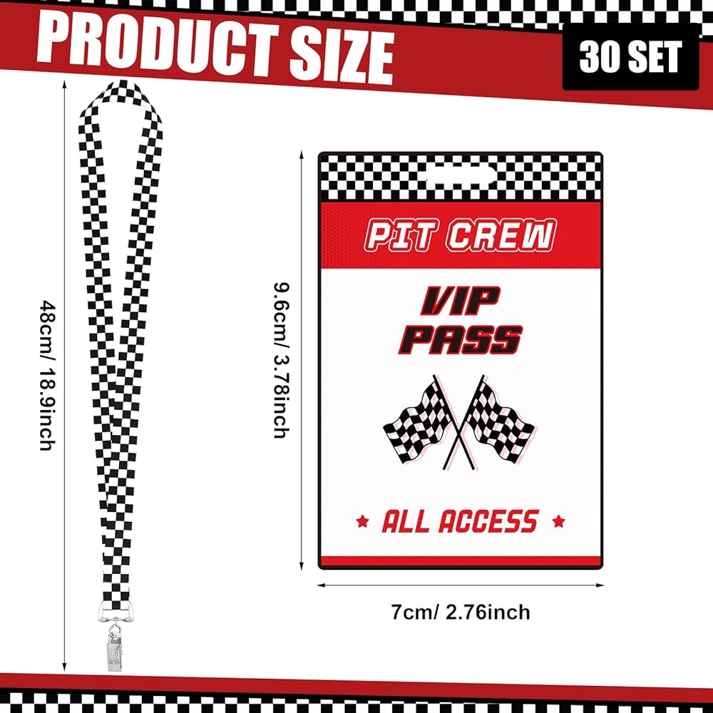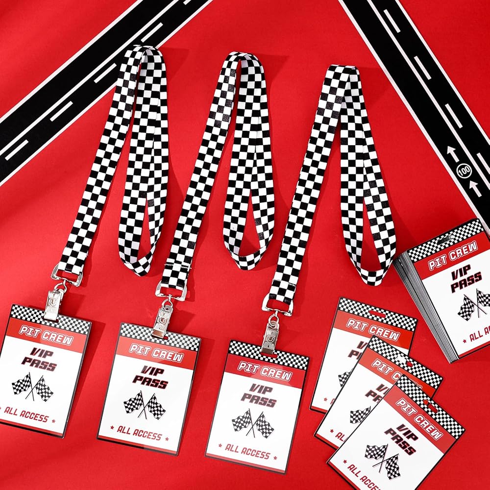 Featuring bold red tone, white and black checkered patterns and dynamic racing flag elements, these VIP pass cards with lanyards for events enhance the excitement of theme race car themed parties; The sleek design adds a vibrant atmosphere to any event.