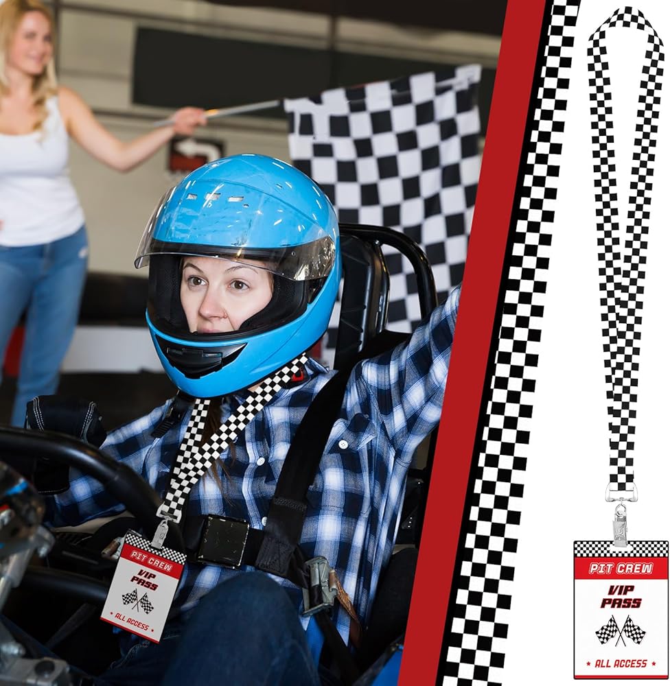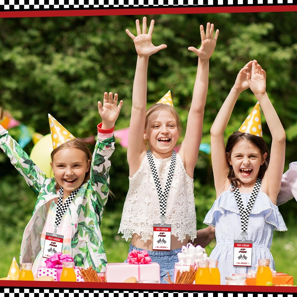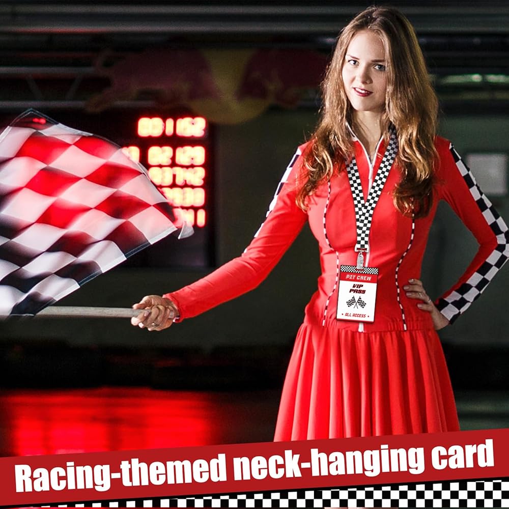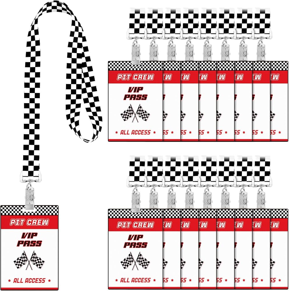 Featuring bold red tone, white and black checkered patterns and dynamic racing flag elements, these VIP pass cards with lanyards for events enhance the excitement of theme race car themed parties; The sleek design adds a vibrant atmosphere to any event.