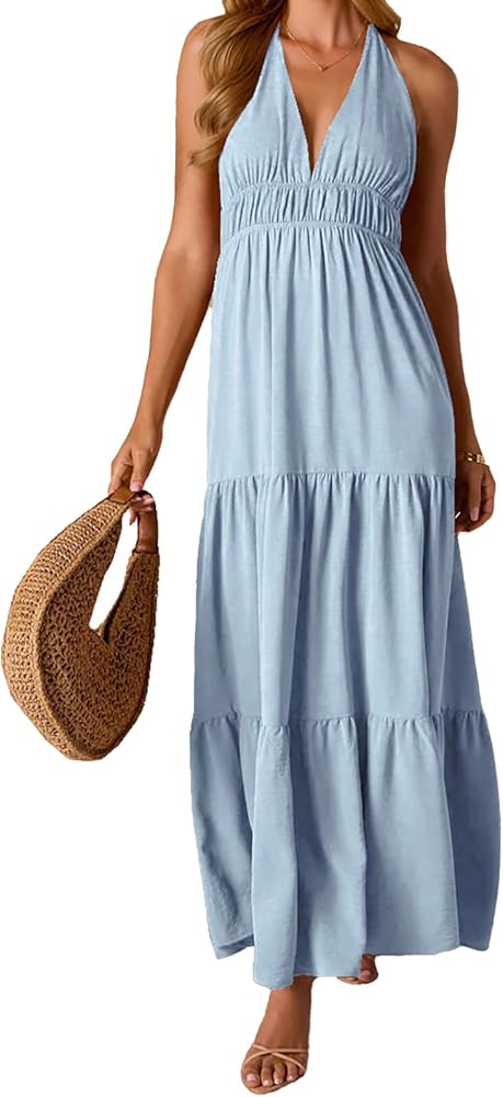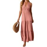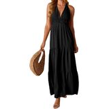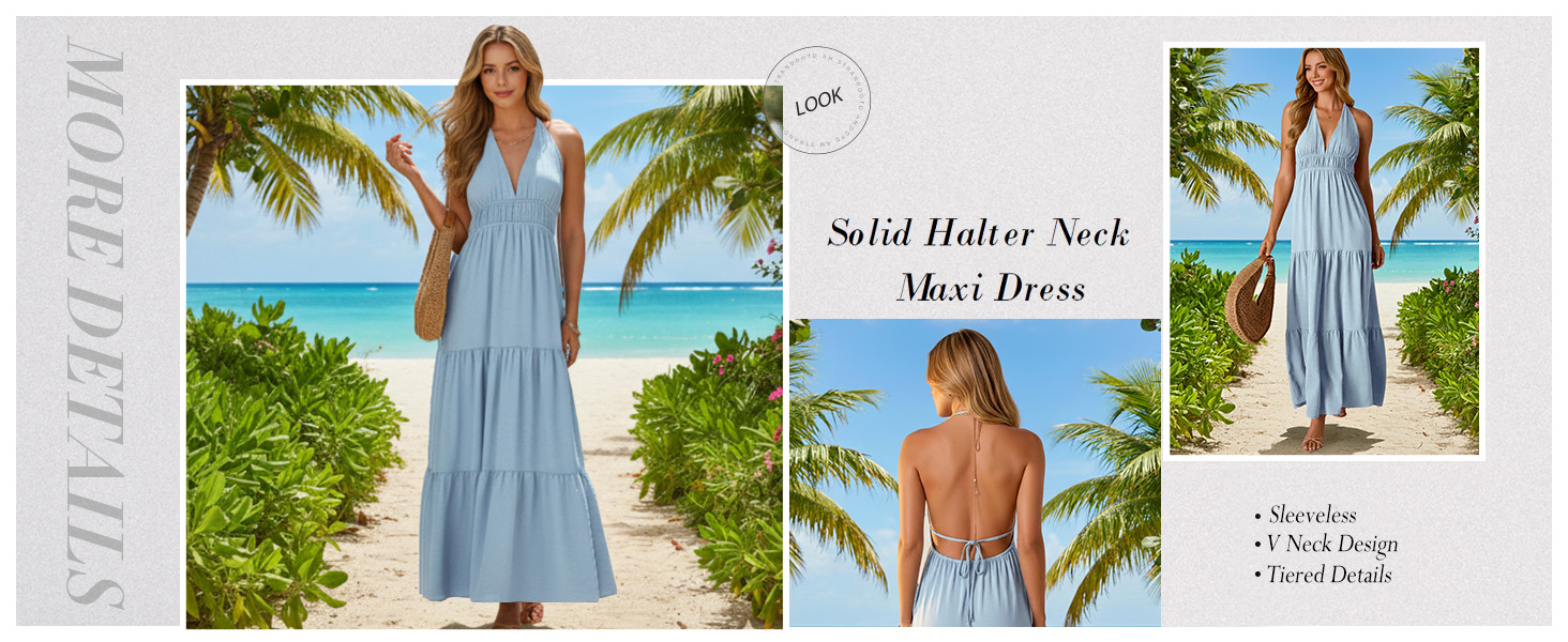 التصميم: يتميز بتصميم فستان طويل ذو لون موحد مع خط عنق عميق على شكل حرف V بدون أكمام، وتفاصيل مطوية أنيقة، وصورة ظلية جذابة على شكل حرف A. يعزز نمط ربطة العنق المفتوحة من الخلف الحركة والأنوثة، مما يخلق فستانًا طويلًا أنيقًا بدون ظهر مع قصة متأرجحة