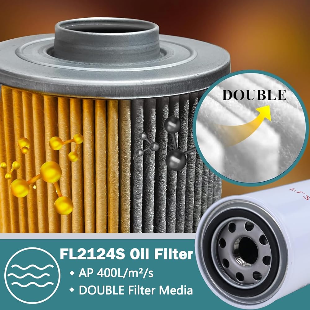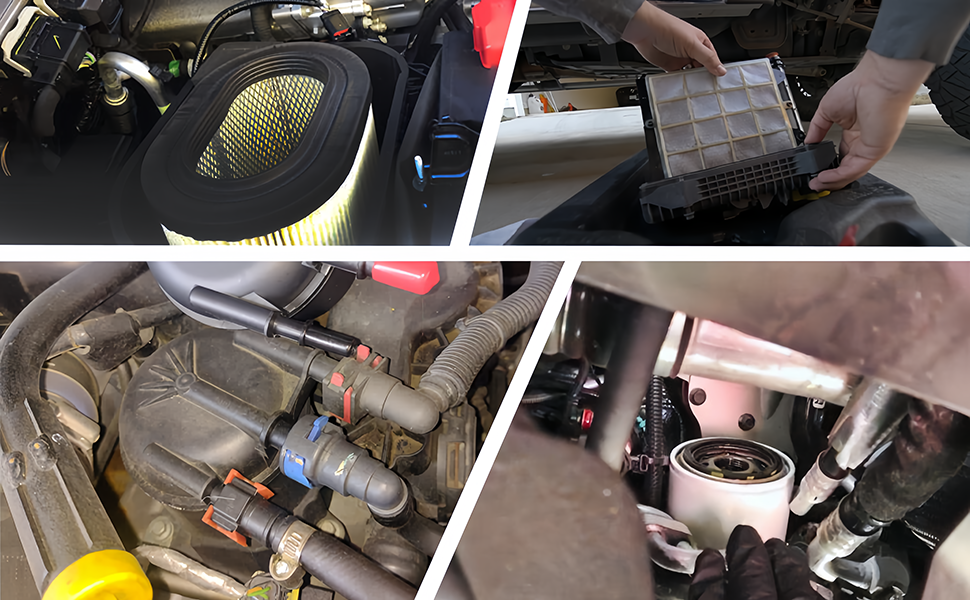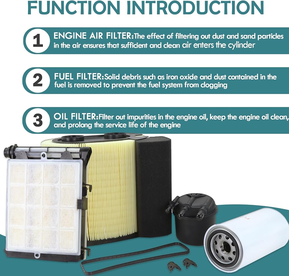 • 【ترشيح فائق】كل فلتر في هذه المجموعة له تأثير مباشر على أداء المحرك والمتانة والاحتفاظ باستهلاك الوقود، وتلعب مجموعة فلتر الديزل دورًا رئيسيًا في صيانة السيارة. يقوم بتصفية الشوائب مثل الوقود والزيت والهواء، ويمنع الانسداد، ويقلل من التآكل الميكانيكي ويضمن التشغيل المستقر للمحرك