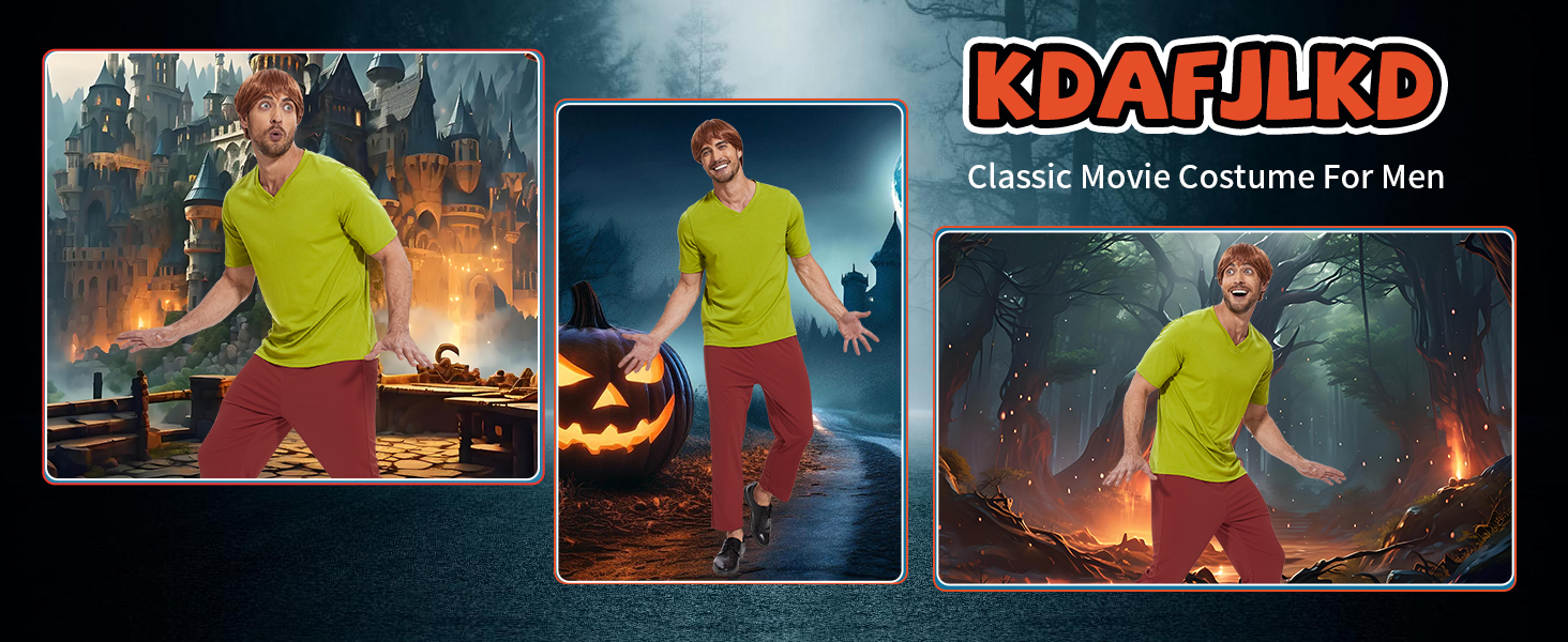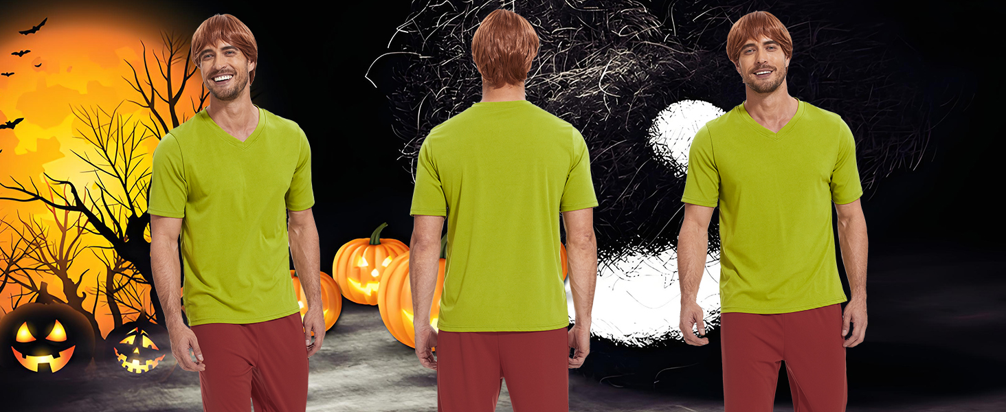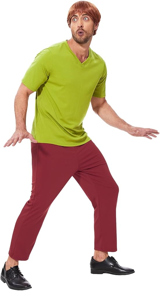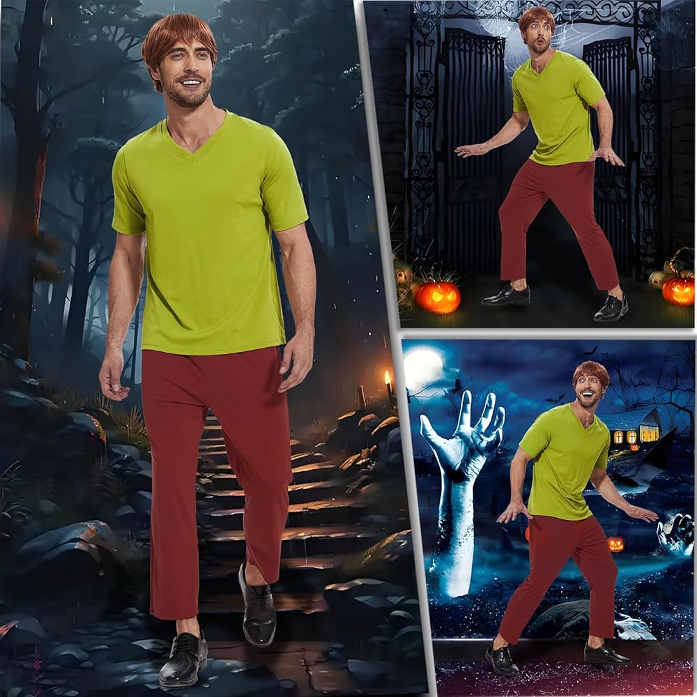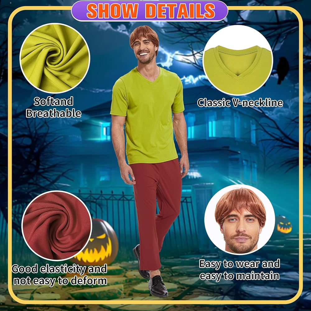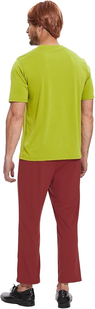 Adult Halloween Costume Men Classic Movie Cartoon Character Costumes Set, Brown Wig, Green T-Shirt and Brown Pants