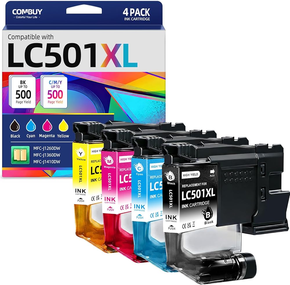 • اسم المنتج: خراطيش حبر COMBUY LC501XL LC501 عالية الإنتاجية متوافقة مع خراطيش حبر Brother LC501XL LC 501XL 4 عبوات (متوافقة تمامًا مع الطابعة)