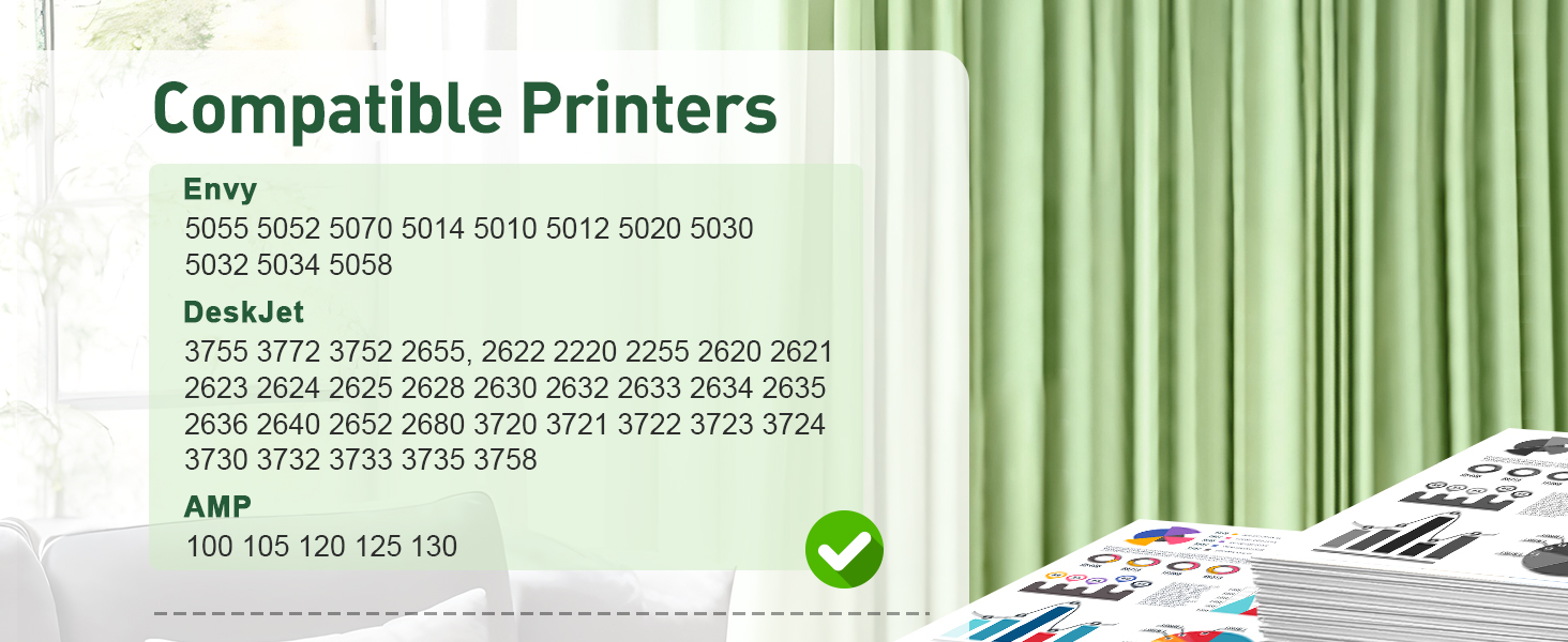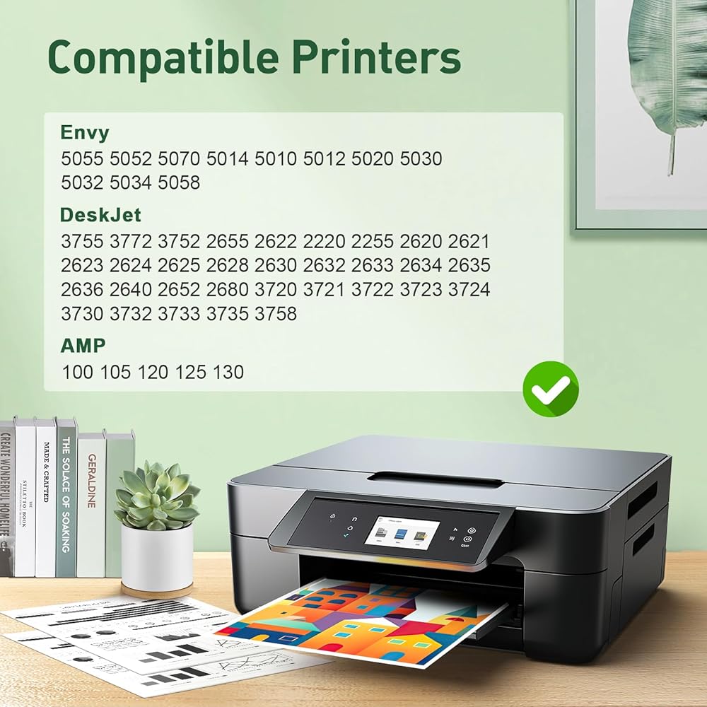 الطابعات المتوافقة: سلسلة HP Deskjet 3700 3772، 3755، 3758، 3752، 3735، 3733، 3732، 3730، 3724، 3723، 3722، 3721، 3720؛ سلسلة HP Envy 5000 5055، 5052، 5058، 5034، 5032، 5030، 5020، 5014، 5012، 5010، 5070